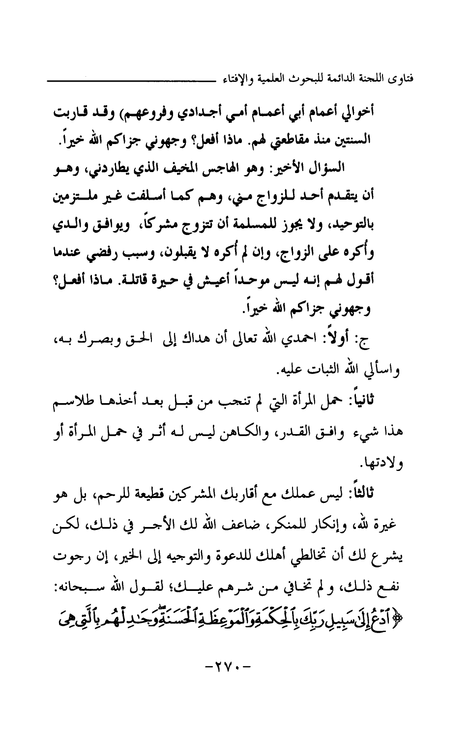 ج: أولا: احمدي الله -تعالى- أن هداك إلى الحق وبصرك به، واسألي الله الثبات عليه. ثانيا: حمل المرأة التي لم تنجب من قبل بعد أخذها طلاسم هذا شيء وافق القدر، والكاهن ليس له أثر في حمل المرأة أو ولادتها. ثالثا: ليس عملك مع أقاربك المشركين قطيعة للرحم، بل هو غيرة لله، وإنكار للمنكر، ضاعف الله لك الأجر في ذلك، لكن يشرع لك أن تخالطي أهلك للدعوة والتوجيه إلى الخير، إن رجوت نفع ذلك، ولم تخافي من شرهم عليك؛ لقول الله سبحانه: {ادْعُ إِلَى سَبِيلِ رَبِّكَ بِالْحِكْمَةِ وَالْمَوْعِظَةِ الْحَسَنَةِ وَجَادِلْهُمْ بِالَّتِي هِيَ أَحْسَنُ} (¬1)