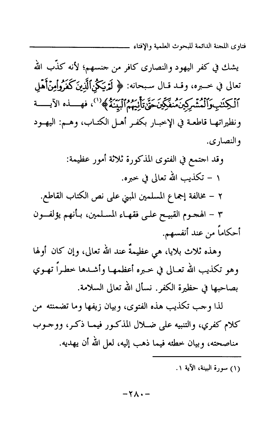 يشك في كفر اليهود والنصارى كافر من جنسهم؛ لأنه كذب الله تعالى في خبره، وقد قال سبحانه: {لَمْ يَكُنِ الَّذِينَ كَفَرُوا مِنْ أَهْلِ الْكِتَابِ وَالْمُشْرِكِينَ مُنْفَكِّينَ حَتَّى تَأْتِيَهُمُ الْبَيِّنَةُ} (¬1) فهذه الآية ونظيراتها قاطعة في الإخبار بكفر أهل الكتاب وهم: اليهود والنصارى. وقد اجتمع في الفتوى المذكورة ثلاثة أمور عظيمة: 1- تكذيب الله تعالى في خبره. 2- مخالفة إجماع المسلمين المبني على نص الكتاب القاطع. 3- الهجوم القبيح على فقهاء المسلمين، بأنهم يؤلفون أحكاما من عند أنفسهم. وهذه ثلاث بلايا، هي عظيمة عند الله تعالى، وإن كان أولها وهو تكذيب الله تعالى في خبره أعظمها وأشدها خطرا تهوي بصاحبها في حظيرة الكفر. نسأل الله تعالى السلامة. لذا وجب تكذيب هذه الفتوى وبيان زيفها وما تضمنته من كلام كفري، والتنبيه على ضلال المذكور فيما ذكر، ووجوب مناصحته، وبيان خطئه فيما ذهب إليه، لعل الله أن يهديه.