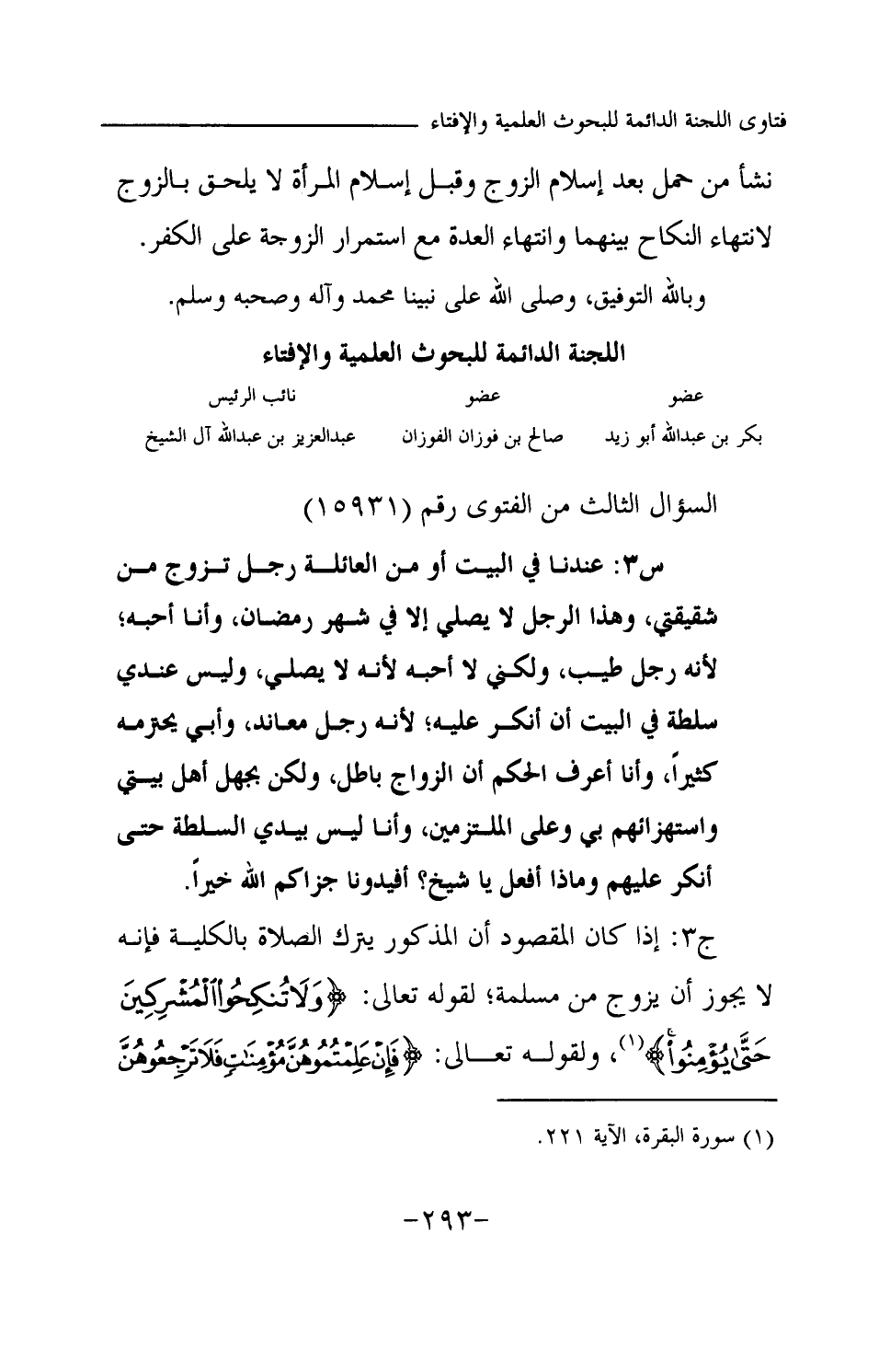 ج3: إذا كان المقصود أن المذكور يترك الصلاة بالكلية فإنه لا يجوز أن يزوج من مسلمة؛ لقوله تعالى: {وَلَا تُنْكِحُوا الْمُشْرِكِينَ حَتَّى يُؤْمِنُوا} (¬1) ولقوله تعالى: {فَإِنْ عَلِمْتُمُوهُنَّ مُؤْمِنَاتٍ فَلَا تَرْجِعُوهُنَّ إِلَى الْكُفَّارِ لَا هُنَّ حِلٌّ لَهُمْ وَلَا هُمْ يَحِلُّونَ لَهُنَّ} (¬2)