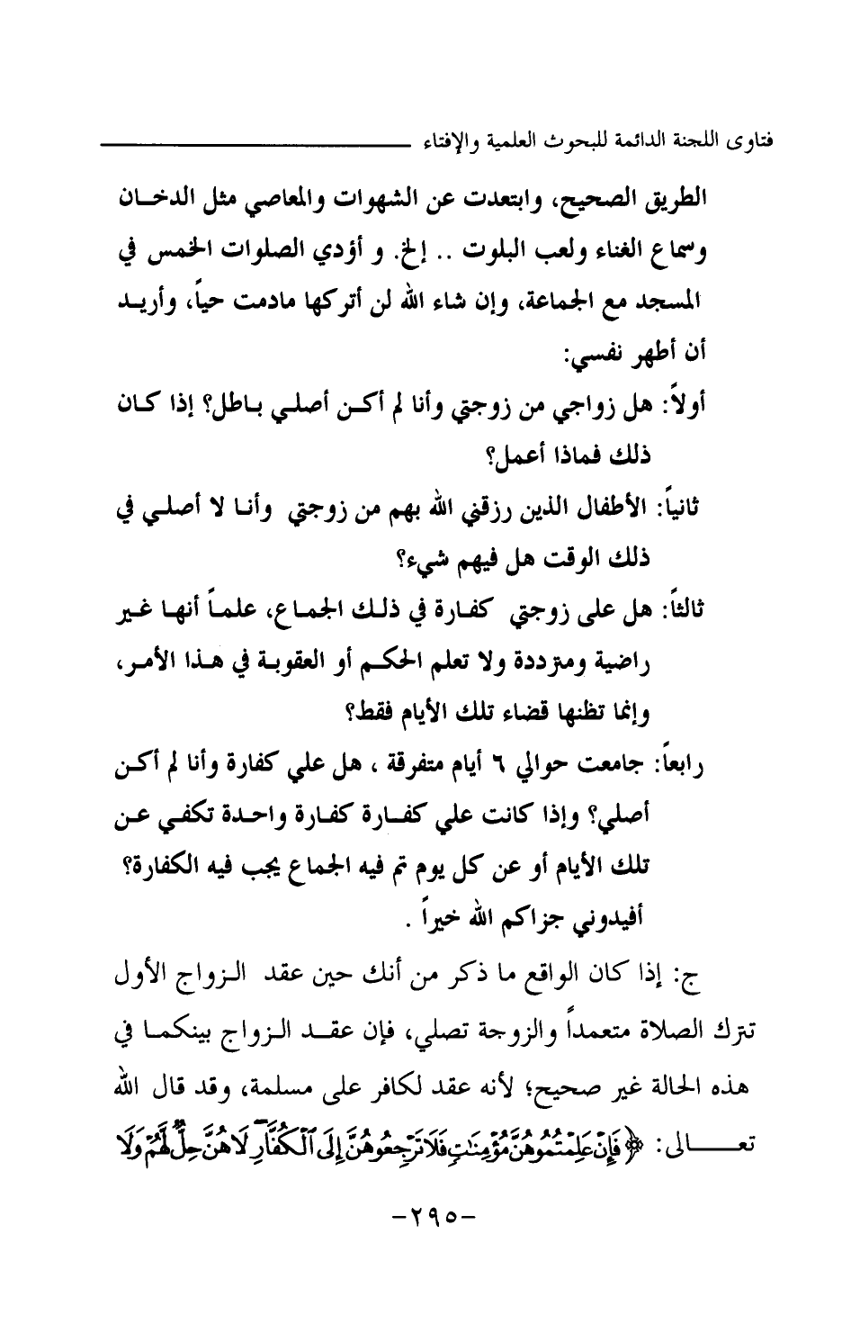 الطريق الصحيح، وابتعدت عن الشهوات والمعاصي مثل الدخان وسماع الغناء ولعب البلوت.. إلخ. وأؤدي الصلوات الخمس في المسجد مع الجماعة، وإن شاء الله لن أتركها ما دمت حيا، وأريد أن أطهر نفسي: أولا: هل زواجي من زوجتي وأنا لم أكن أصلي باطل؟ إذا كان ذلك فماذا أعمل؟ ثانيا: الأطفال الذين رزقني الله بهم من زوجتي وأنا لا أصلي في ذلك الوقت هل فيهم شيء؟ ثالثا: هل على زوجتي كفارة في ذلك الجماع، علما أنها غير راضية ومترددة ولا تعلم الحكم أو العقوبة في هذا الأمر، وإنما تظنها قضاء تلك الأيام فقط؟ رابعا: جامعت حوالي 6 أيام متفرقة، هل علي كفارة وأنا لم أكن أصلي؟ وإذا كانت علي كفارة، كفارة واحدة تكفي عن تلك الأيام أو عن كل يوم تم فيه الجماع يجب فيه الكفارة؟ أفيدوني جزاكم الله خيرا.