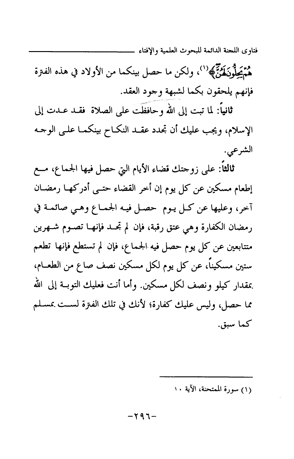 ولكن ما حصل بينكما من الأولاد في هذه الفترة فإنهم يلحقون بكما لشبهة وجود العقد. ثانيا: لما تبت إلى الله وحافظت على الصلاة فقد عدت إلى الإسلام، ويجب عليك أن تجدد عقد النكاح بينكما على الوجه الشرعي. ثالثا: على زوجتك قضاء الأيام التي حصل فيها الجماع، مع إطعام مسكين عن كل يوم إن أخر القضاء حتى أدركها رمضان آخر، وعليها عن كل يوم حصل فيه الجماع وهي صائمة في رمضان الكفارة وهي عتق رقبة، فإن لم تجد فإنها تصوم شهرين متتابعين عن كل يوم حصل فيه الجماع، فإن لم تستطع فإنها تطعم ستين مسكينا، عن كل يوم لكل مسكين نصف صاع من الطعام بمقدار كيلو ونصف لكل مسكين. وأما أنت فعليك التوبة إلى الله مما حصل، وليس عليك كفارة؛ لأنك في تلك الفترة لست بمسلم كما سبق.