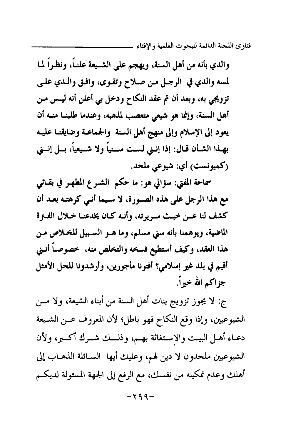 والدي بأنه من أهل السنة ويهجم على الشيعة علنا، ونظرا لما لمسه والدي في الرجل من صلاح وتقوى، وافق والدي على تزويجي به، وبعد أن تم عقد النكاح ودخل بي أعلن أنه ليس من أهل السنة وإنما هو شيعي متعصب لمذهبه، وعندما طلبنا منه أن يعود إلى الإسلام وإلى منهج أهل السنة والجماعة وضايقنا عليه بهذا الشأن قال: إذا إنني لست سنيا ولا شيعيا، بل إنني (كميونست) أي: شيوعي ملحد.