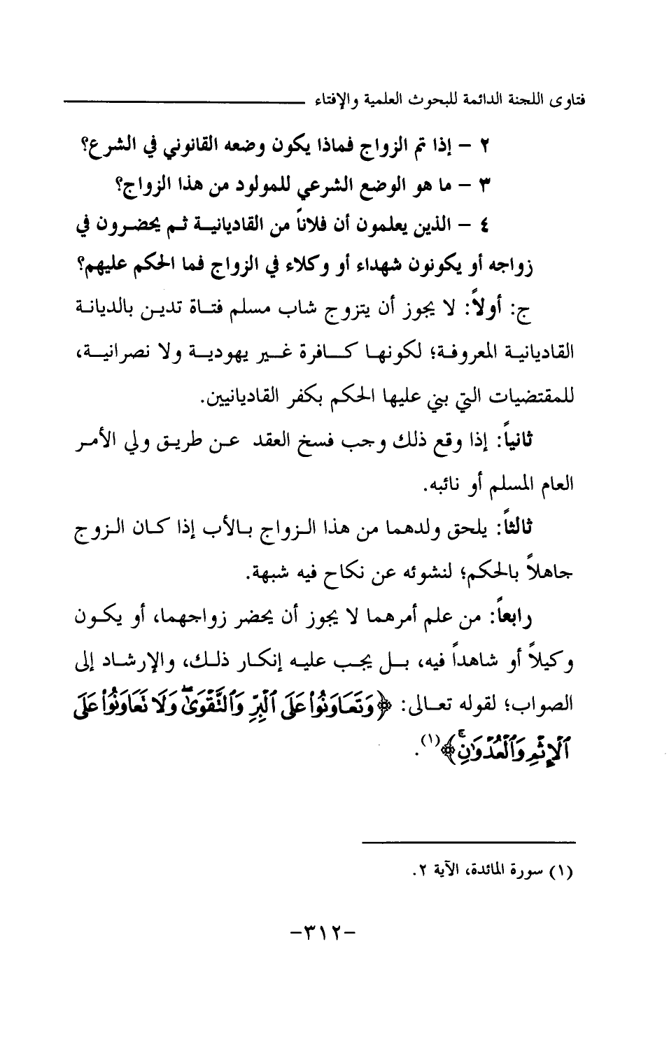 ج: أولا: لا يجوز أن يتزوج شاب مسلم فتاة تدين بالديانة القاديانية المعروفة؛ لكونها كافرة غير يهودية ولا نصرانية، للمقتضيات التي بني عليها الحكم بكفر القاديانيين ثانيا: إذا وقع ذلك وجب فسخ العقد عن طريق ولي الأمر العام المسلم أو نائبه. ثالثا: يلحق ولدهما من هذا الزواج بالأب إذا كان الزوج جاهلا بالحكم؛ لنشوئه عن نكاح فيه شبهة. رابعا: من علم أمرهما لا يجوز أن يحضر زواجهما، أو يكون وكيلا أو شاهدا فيه، بل يجب عليه إنكار ذلك، والإرشاد إلى الصواب؛ لقوله تعالى: {وَتَعَاوَنُوا عَلَى الْبِرِّ وَالتَّقْوَى وَلَا تَعَاوَنُوا عَلَى الْإِثْمِ وَالْعُدْوَانِ} (¬1)