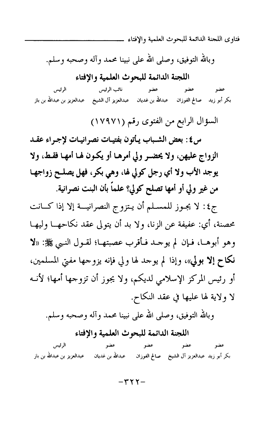 ج 4: لا يجوز للمسلم أن يتزوج النصرانية إلا إذا كانت محصنة، أي: عفيفة عن الزنا، ولا بد أن يتولى عقد نكاحها وليها وهو أبوها، فإن لم يوجد فأقرب عصبتها؛ لقول النبي -صلى الله عليه وسلم-: «لا نكاح إلا بولي (¬1) » وإذا لم يوجد لها ولي فإنه يزوجها مفتي المسلمين، أو رئيس المركز الإسلامي لديكم، ولا يجوز أن تزوجها أمها؛ لأنه لا ولاية لها عليها في عقد النكاح. وبالله التوفيق، وصلى الله على نبينا محمد وآله وصحبه وسلم.