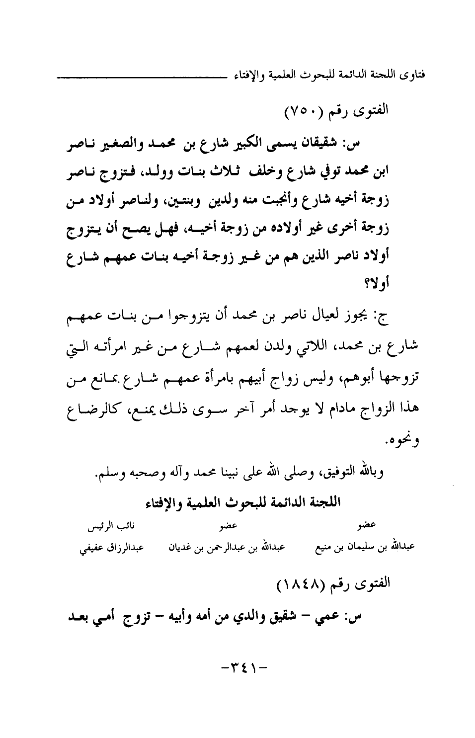 ج: يجوز لعيال ناصر بن محمد أن يتزوجوا من بنات عمهم شارع بن محمد، اللاتي ولدن لعمهم شارع من غير امرأته التي تزوجها أبوهم، وليس زواج أبيهم بامرأة عمهم شارع بمانع من هذا الزواج ما دام لا يوجد أمر آخر سوى ذلك يمنع، كالرضاع ونحوه. وبالله التوفيق، وصلى الله على نبينا محمد وآله وصحبه وسلم.