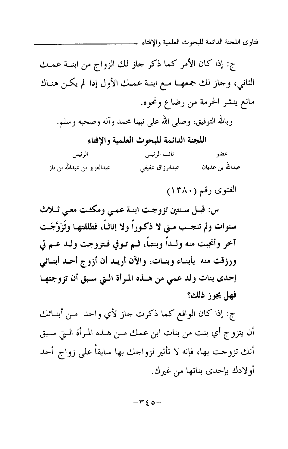 ج: إذا كان الأمر كما ذكر جاز لك الزواج من ابنة عمك الثاني، وجاز لك جمعها مع ابنة عمك الأول إذا لم يكن هناك مانع ينشر الحرمة من رضاع ونحوه. وبالله التوفيق، وصلى الله على نبينا محمد وآله وصحبه وسلم.