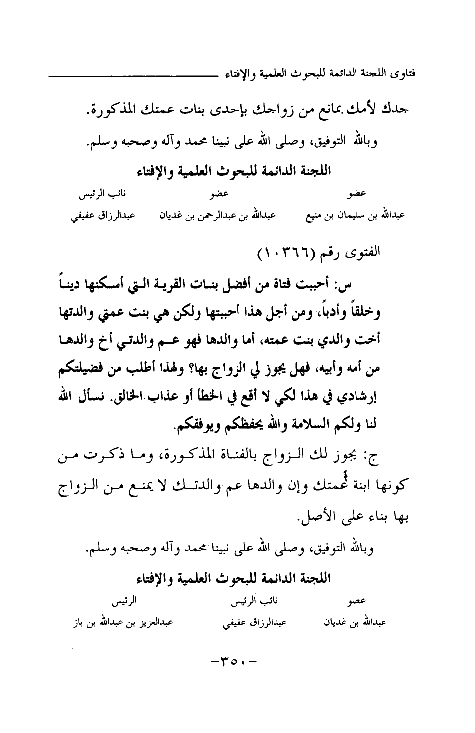 ج: يجوز لك الزواج بالفتاة المذكورة، وما ذكرت من كونها ابنة عمتك وإن والدها عم والدتك لا يمنع من الزواج بها بناء على الأصل. وبالله التوفيق، وصلى الله على نبينا محمد وآله وصحبه وسلم.