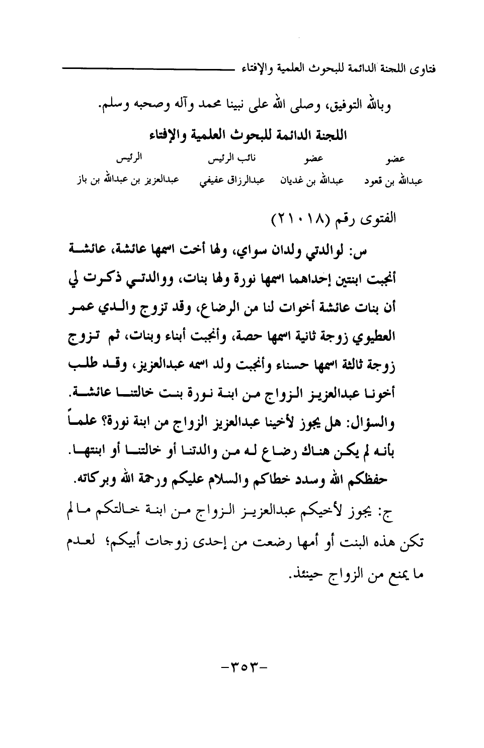 س: لوالدتي ولدان سواي، ولها أخت اسمها عائشة، عائشة أنجبت ابنتين إحداهما اسمها نورة ولها بنات، ووالدتي ذكرت لي أن بنات عائشة أخوات لنا من الرضاع، وقد تزوج والدي عمر العطيوي زوجة ثانية اسمها حصة، وأنجبت أبناء وبنات، ثم تزوج زوجة ثالثة اسمها حسناء، وأنجبت ولدا اسمه عبد العزيز، وقد طلب أخونا عبد العزيز الزواج من ابنة نورة بنت خالتنا عائشة.