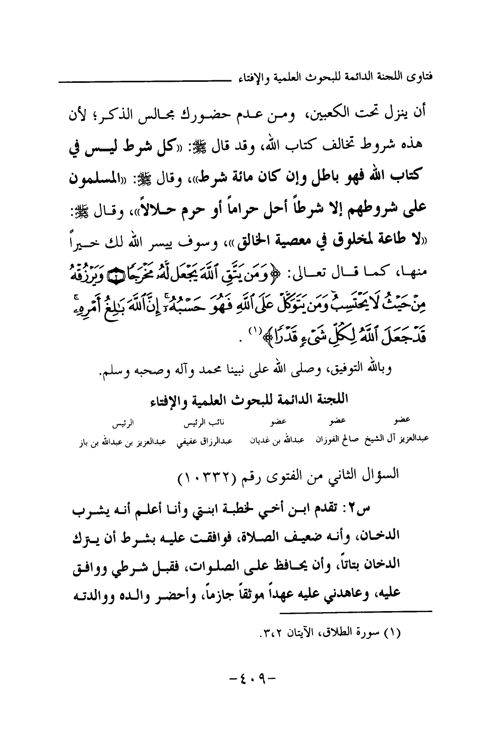 أن ينزل تحت الكعبين، ومن عدم حضورك مجالس الذكر؛ لأن هذه شروط تخالف كتاب الله، وقد قال صلى الله عليه وسلم: «كل شرط ليس في كتاب الله فهو باطل وإن كان مائة شرط (¬1) » وقال صلى الله عليه وسلم: «المسلمون على شروطهم إلا شرطا أحل حراما أو حرم حلالا (¬2) » وقال صلى الله عليه وسلم: «لا طاعة لمخلوق في معصية الخالق (¬3) » وسوف ييسر الله لك خيرا منها، كما قال تعالى: {وَمَنْ يَتَّقِ اللَّهَ يَجْعَلْ لَهُ مَخْرَجًا} (¬4) {وَيَرْزُقْهُ مِنْ حَيْثُ لَا يَحْتَسِبُ وَمَنْ يَتَوَكَّلْ عَلَى اللَّهِ فَهُوَ حَسْبُهُ إِنَّ اللَّهَ بَالِغُ أَمْرِهِ قَدْ جَعَلَ اللَّهُ لِكُلِّ شَيْءٍ قَدْرًا} (¬5) وبالله التوفيق، وصلى الله على نبينا محمد وآله وصحبه وسلم.