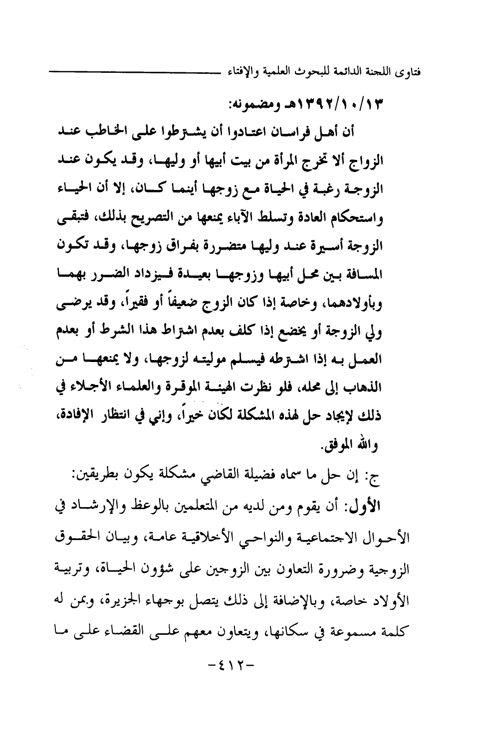 ج: إن حل ما سماه فضيلة القاضي مشكلة يكون بطريقين: الأول: أن يقوم ومن لديه من المتعلمين بالوعظ والإرشاد في الأحوال الاجتماعية والنواحي الأخلاقية عامة، وبيان الحقوق الزوجية وضرورة التعاون بين الزوجين على شؤون الحياة، وتربية الأولاد خاصة، وبالإضافة إلى ذلك يتصل بوجهاء الجزيرة وبمن له كلمة مسموعة في سكانها، ويتعاون معهم على القضاء على ما