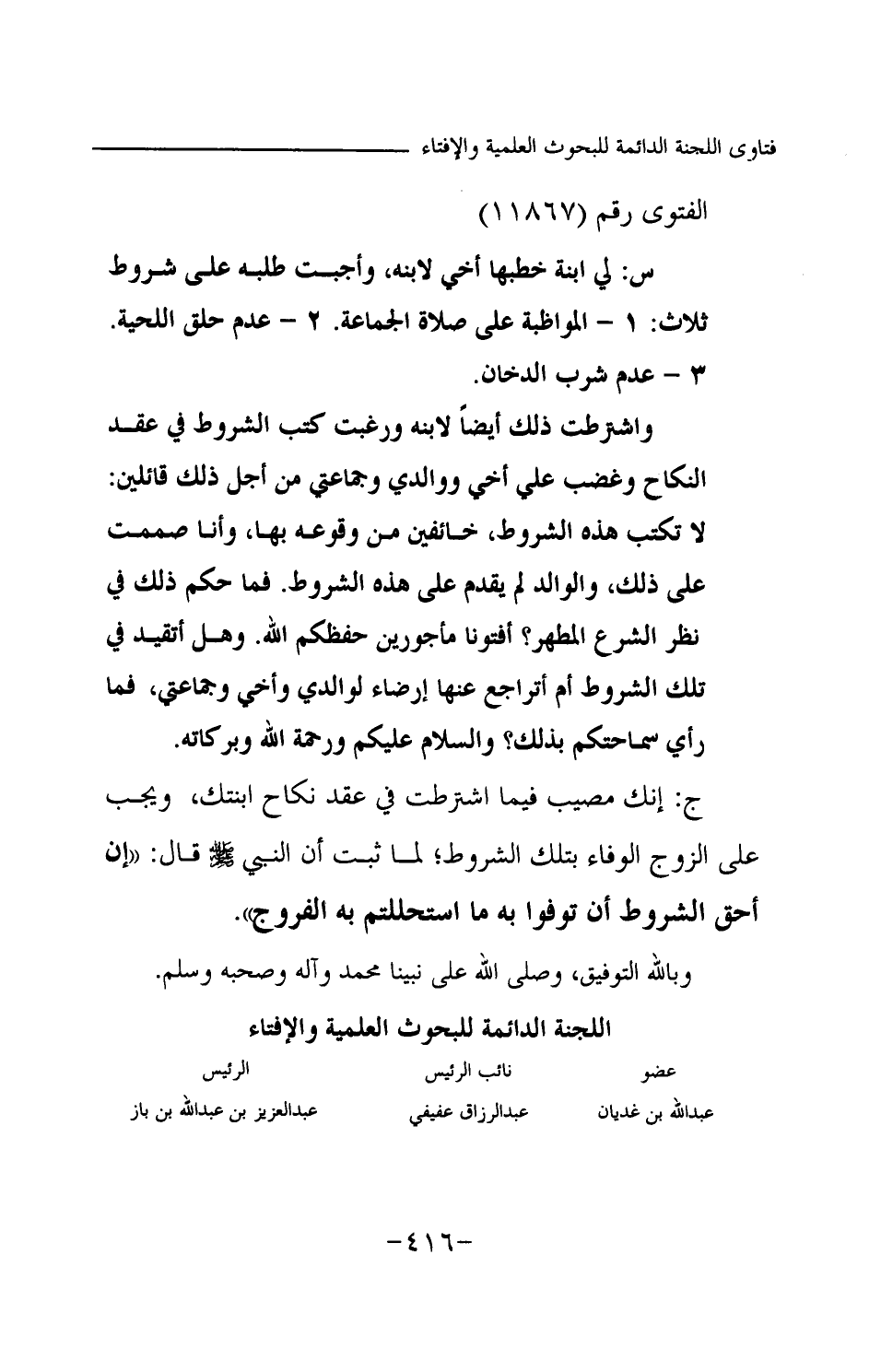 ج: إنك مصيب فيما اشترطت في عقد نكاح ابنتك، ويجب على الزوج الوفاء بتلك الشروط؛ لما ثبت أن النبي صلى الله عليه وسلم قال: «إن أحق الشروط أن توفوا به ما استحللتم به الفروج (¬1) » وبالله التوفيق، وصلى الله على نبينا محمد وآله وصحبه وسلم.