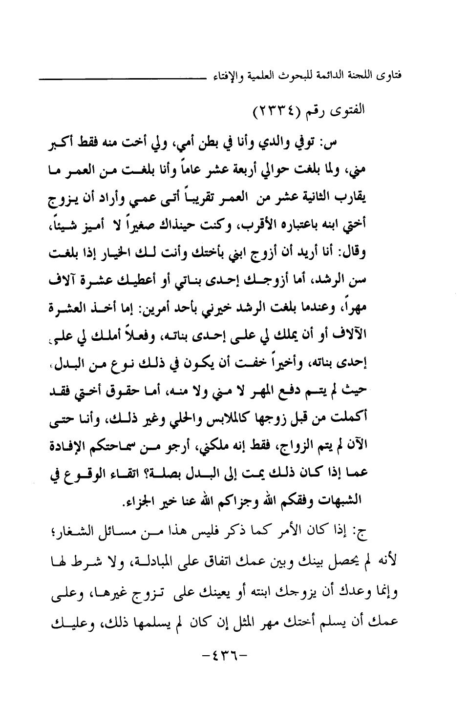 س: توفي والدي وأنا في بطن أمي، ولي أخت منه فقط أكبر مني، ولما بلغت حوالي أربعة عشر عاما وأنا بلغت من العمر ما يقارب الثانية عشر من العمر تقريبا أتى عمي وأراد أن يزوج أختي ابنه باعتباره الأقرب، وكنت حينذاك صغيرا لا أميز شيئا، وقال: أنا أريد أن أزوج ابني بأختك وأنت لك الخيار إذا بلغت سن الرشد، إما أزوجك إحدى بناتي أو أعطيك عشرة آلاف مهرا، وعندما بلغت الرشد خيرني بأحد أمرين: إما أخذ العشرة الآلاف أو أن يملك لي على إحدى بناته، وفعلا أملك لي على إحدى بناته، وأخيرا خفت أن يكون في ذلك نوع من البدل، حيث لم يتم دفع المهر لا مني ولا منه، أما حقوق أختي فقد أكملت من قبل زوجها كالملابس والحلي وغير ذلك، وأنا حتى الآن لم يتم الزواج، فقط إنه ملكني، أرجو من سماحتكم الإفادة عما إذا كان ذلك يمت إلى البدل بصلة؟ اتقاء الوقوع في الشبهات وفقكم الله وجزاكم الله عنا خير الجزاء.