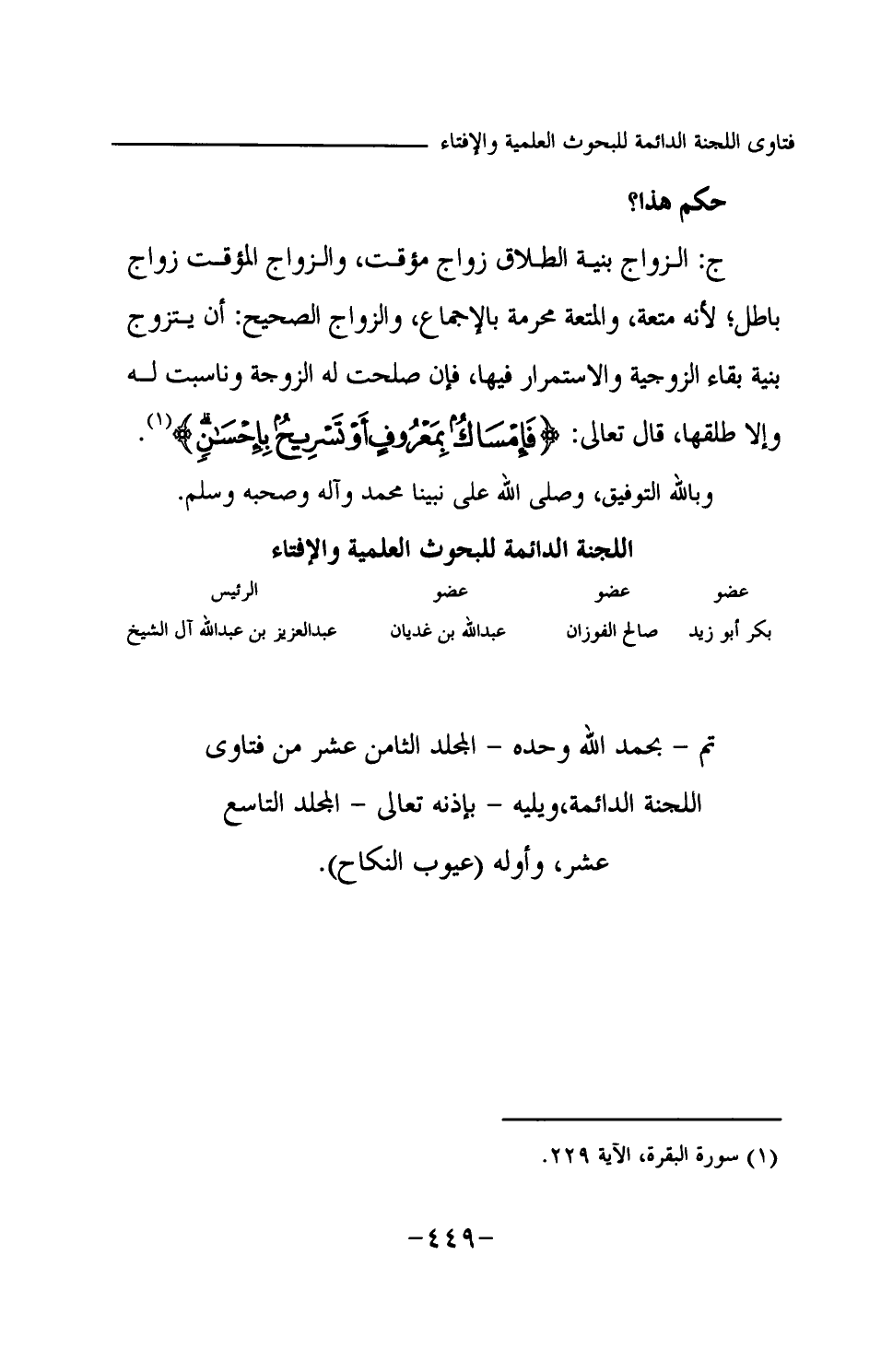 ج: الزواج بنية الطلاق زواج مؤقت، والزواج المؤقت زواج باطل؛ لأنه متعة، والمتعة محرمة بالإجماع، والزواج الصحيح: أن يتزوج بنية بقاء الزوجية والاستمرار فيها، فإن صلحت له الزوجة وناسبت له وإلا طلقها، قال تعالى: {فَإِمْسَاكٌ بِمَعْرُوفٍ أَوْ تَسْرِيحٌ بِإِحْسَانٍ} (¬1) وبالله التوفيق، وصلى الله على نبينا محمد وآله وصحبه وسلم.