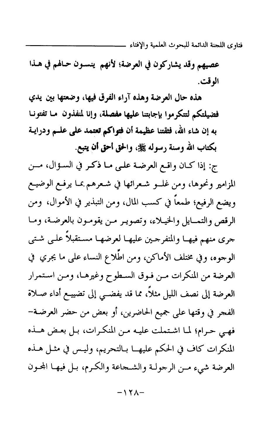 ج: إذا كان واقع العرضة على ما ذكر في السؤال، من المزامير ونحوها، ومن غلو شعرائها في شعرهم بما يرفع الوضيع ويضع الرفيع؛ طمعا في كسب المال، ومن التبذير في الأموال، ومن الرقص والتمايل والخيلاء، وتصوير من يقومون بالعرضة، وما جرى منهم فيها والمتفرجين عليها لعرضها مستقبلا على شتى الوجوه، وفي مختلف الأماكن، ومن اطلاع النساء على ما يجري في العرضة من المنكرات من فوق السطوح وغيرها، ومن استمرار العرضة إلى نصف الليل مثلا، مما قد يفضي إلى تضييع أداء صلاة الفجر في وقتها على جميع الحاضرين، أو بعض من حضر العرضة- فهي حرام؛ لما اشتملت عليه من المنكرات، بل بعض هذه المنكرات كاف في الحكم عليها بالتحريم، وليس في مثل هذه العرضة شيء من الرجولة والشجاعة والكرم، بل فيها المجون