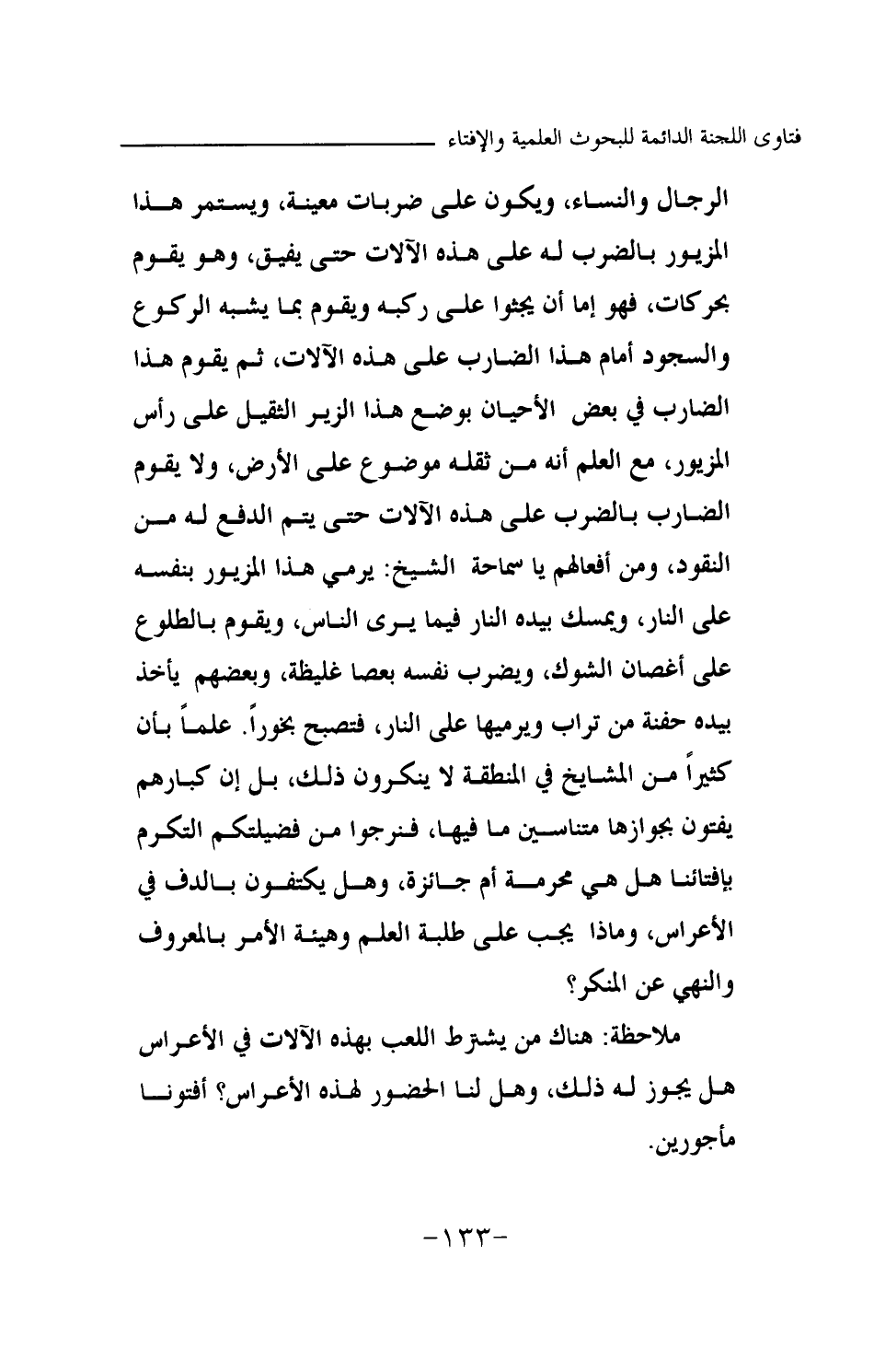 الرجال والنساء، ويكون على ضربات معينة، ويستمر هذا المزيور بالضرب له على هذه الآلات حتى يفيق، وهو يقوم بحركات، فهو إما أن يجثو على ركبه ويقوم بما يشبه الركوع والسجود أمام هذا الضارب على هذه الآلات، ثم يقوم هذا الضارب في بعض الأحيان بوضع هذا الزير الثقيل على رأس المزيور، مع العلم أنه من ثقله موضوع على الأرض، ولا يقوم الضارب بالضرب على هذه الآلات حتى يتم الدفع له من النقود. ومن أفعالهم يا سماحة الشيخ: يرمي هذا المزيور بنفسه على النار، ويمسك بيده النار فيما يرى الناس، ويقوم بالطلوع على أغصان الشوك، ويضرب نفسه بعصا غليظة، وبعضهم يأخذ بيده حفنة من تراب ويرميها على النار، فتصبح بخورا. علما بأن كثيرا من المشايخ في المنطقة لا ينكرون ذلك، بل إن كبارهم يفتون بجوازها متناسين ما فيها، فنرجو من فضيلتكم التكرم بإفتائنا هل هي محرمة أم جائزة، وهل يكتفون بالدف في الأعراس، وماذا يجب على طلبة العلم وهيئة الأمر بالمعروف والنهي عن المنكر؟ ملاحظة: هناك من يشترط اللعب بهذه الآلات في الأعراس هل يجوز له ذلك، وهل لنا الحضور لهذه الأعراس؟ أفتونا مأجورين.