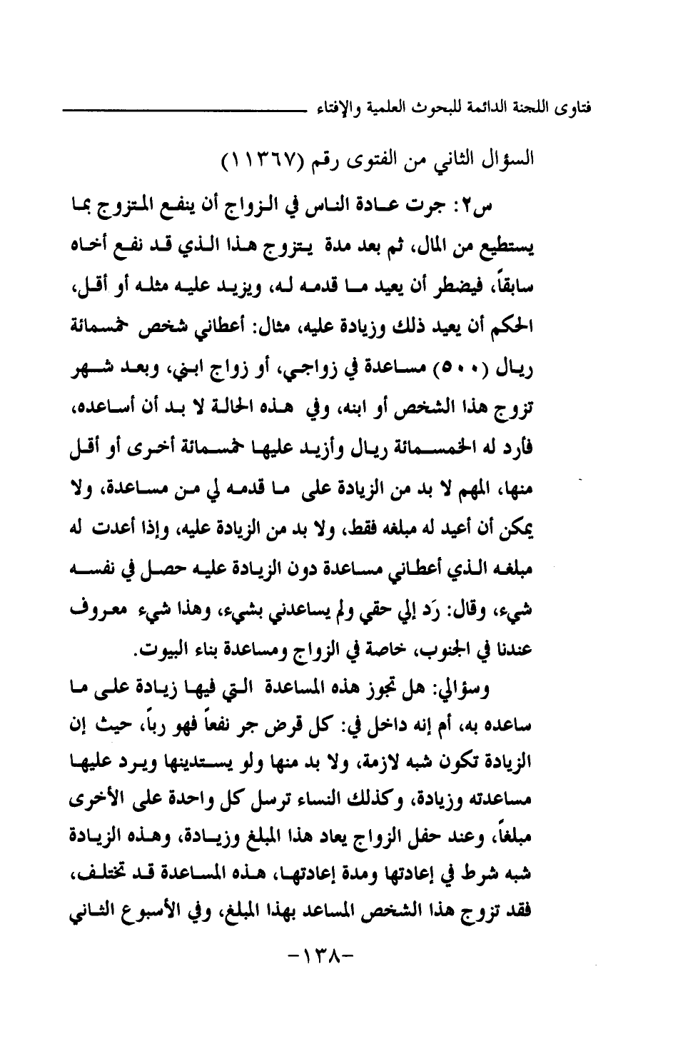 س2: جرت عادة الناس في الزواج أن ينفع المتزوج بما يستطيع من المال، ثم بعد مدة يتزوج هذا الذي قد نفع أخاه سابقا، فيضطر أن يعيد ما قدمه له، ويزيد عليه مثله أو أقل، الحكم أن يعيد ذلك وزيادة عليه، مثال: أعطاني شخص خمسمائة ريال (500) مساعدة في زواجي، أو زواج ابني، وبعد شهر تزوج هذا الشخص أو ابنه، وفي هذه الحالة لا بد أن أساعده، فأرد له الخمسمائة ريال وأزيد عليها خمسمائة أخرى أو أقل منها، المهم لا بد من الزيادة على ما قدمه لي من مساعدة، ولا يمكن أن أعيد له مبلغه فقط، ولا بد من الزيادة عليه، وإذا أعدت له مبلغه الذي أعطاني مساعدة دون الزيادة عليه حصل في نفسه شيء، وقال: رد إلي حقي ولم يساعدني بشيء، وهذا شيء معروف عندنا في الجنوب، خاصة في الزواج ومساعدة بناء البيوت. وسؤالي: هل تجوز هذه المساعدة التي فيها زيادة على ما ساعده به، أم إنه داخل في: كل قرض جر نفعا فهو ربا، حيث إن الزيادة تكون شبه لازمة، ولا بد منها ولو يستدينها ويرد عليها مساعدته وزيادة، وكذلك النساء ترسل كل واحدة على الأخرى مبلغا، وعند حفل الزواج يعاد هذا المبلغ وزيادة، وهذه الزيادة شبه شرط في إعادتها ومدة إعادتها، هذه المساعدة قد تختلف، فقد تزوج هذا الشخص المساعد بهذا المبلغ، وفي الأسبوع الثاني
