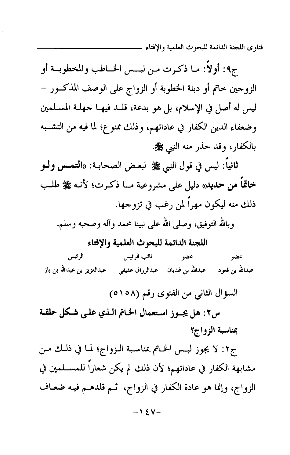 ج2: لا يجوز لبس الخاتم بمناسبة الزواج؛ لما في ذلك من مشابهة الكفار في عاداتهم؛ لأن ذلك لم يكن شعارا للمسلمين في الزواج، وإنما هو عادة الكفار في الزواج، ثم قلدهم فيه ضعاف