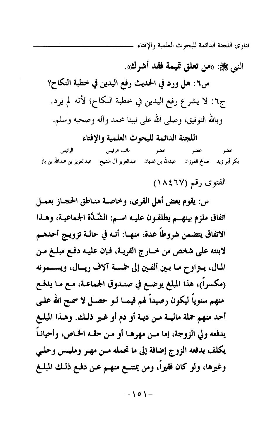 س: يقوم بعض أهل القرى، وخاصة مناطق الحجاز بعمل اتفاق ملزم بينهم يطلقون عليه اسم: الشدة الجماعية، وهذا الاتفاق يتضمن شروطا عدة، منها: أنه في حالة تزويج أحدهم لابنته على شخص من خارج القرية، فإن عليه دفع مبلغ من المال، يتراوح ما بين ألفين إلى خمسة آلاف ريال، ويسمونه (مكسرا) ، هذا المبلغ يوضع في صندوق الجماعة، مع ما يدفع منهم سنويا ليكون رصيدا لهم فيما لو حصل -لا سمح الله- على أحد منهم حملة مالية من دية أو دم أو غير ذلك.