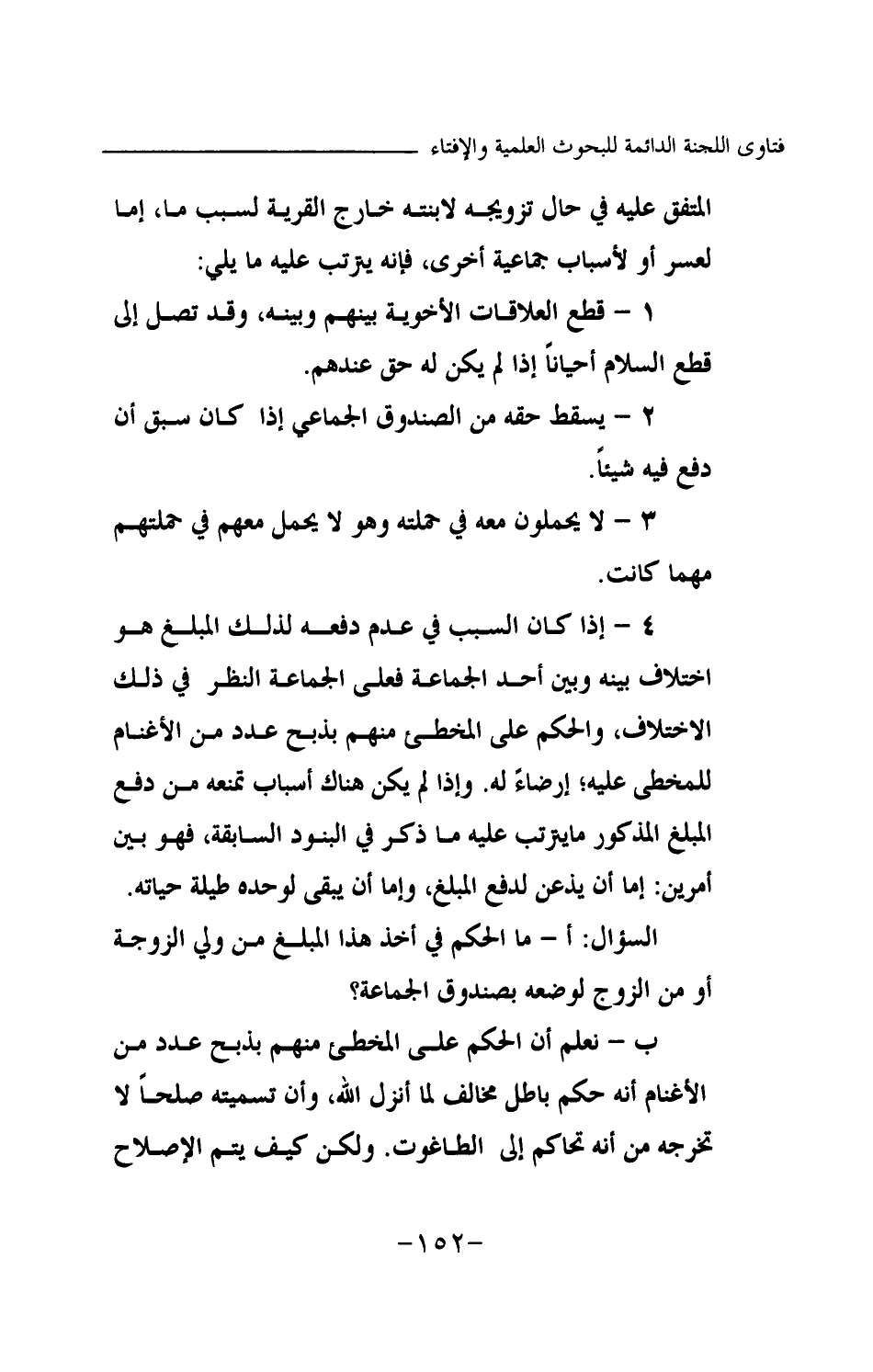 4 - إذا كان السبب في عدم دفعه لذلك المبلغ هو اختلاف بينه وبين أحد الجماعة فعلى الجماعة النظر في ذلك الاختلاف، والحكم على المخطئ منهم بذبح عدد من الأغنام للمخطئ عليه؛ إرضاء له. وإذا لم يكن هناك أسباب تمنعه من دفع المبلغ المذكور ما يرتب عليه ما ذكر في البنود السابقة، فهو بين أمرين: إما أن يذعن لدفع المبلغ، وإما أن يبقى لوحده طيلة حياته. السؤال: أ- ما الحكم في أخذ هذا المبلغ من ولي الزوجة أو من الزوج لوضعه بصندوق الجماعة؟ ب- نعلم أن الحكم على المخطئ منهم بذبح عدد من الأغنام أنه حكم باطل مخالف لما أنزل الله، وأن تسميته صلحا لا تخرجه من أنه تحاكم إلى الطاغوت. ولكن كيف يتم الإصلاح
