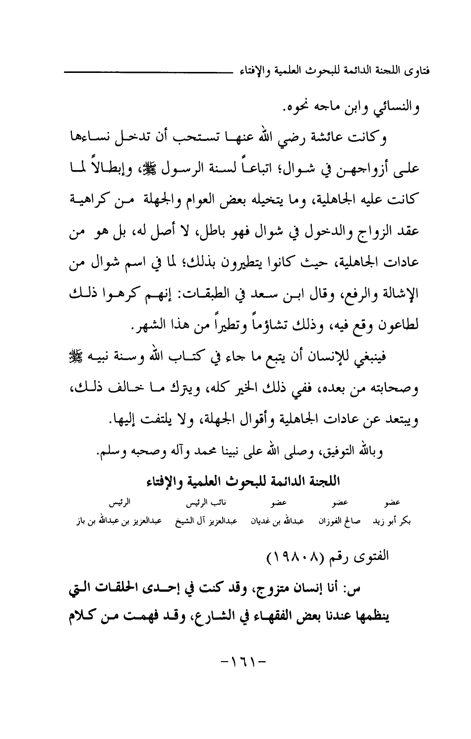 والنسائي وابن ماجه نحوه. وكانت عائشة رضي الله عنها تستحب أن تدخل نساؤها على أزواجهن في شوال؛ اتباعا لسنة الرسول -صلى الله عليه وسلم- وإبطالا لما كانت عليه الجاهلية، وما يتخيله بعض العوام والجهلة من كراهية عقد الزواج والدخول في شوال فهو باطل، لا أصل له، بل هو من عادات الجاهلية، حيث كانوا يتطيرون بذلك؛ لما في اسم شوال من الإشالة والرفع، وقال ابن سعد في الطبقات: إنهم كرهوا ذلك لطاعون وقع فيه، وذلك تشاؤما وتطيرا من هذا الشهر. فينبغي للإنسان أن يتبع ما جاء في كتاب الله وسنة نبيه -صلى الله عليه وسلم- وصحابته من بعده، ففي ذلك الخير كله، ويترك ما خالف ذلك، ويبتعد عن عادات الجاهلية وأقوال الجهلة، ولا يلتفت إليها. وبالله التوفيق، وصلى الله على نبينا محمد وآله وصحبه وسلم.