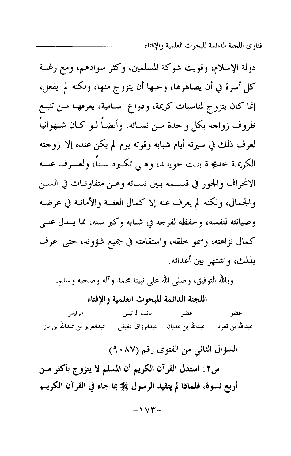 دولة الإسلام، وقويت شوكة المسلمين، وكثر سوادهم، ومع رغبة كل أسرة في أن يصاهرها، وحبها أن يتزوج منها، ولكنه لم يفعل، إنما كان يتزوج لمناسبات كريمة، ودواع سامية، يعرفها من تتبع ظروف زواجه بكل واحدة من نسائه، وأيضا لو كان شهوانيا لعرف ذلك في سيرته أيام شبابه وقوته يوم لم يكن عنده إلا زوجته الكريمة خديجة بنت خويلد وهي تكبره سنا، ولعرف عنه الانحراف والجور في قسمه بين نسائه وهن متفاوتات في السن والجمال، ولكنه لم يعرف عنه إلا كمال العفة والأمانة في عرضه وصيانته لنفسه، وحفظه لفرجه في شبابه وكبر سنه، مما يدل على كمال نزاهته، وسمو خلقه، واستقامته في جميع شؤونه، حتى عرف بذلك، واشتهر بين أعدائه. وبالله التوفيق، وصلى الله على نبينا محمد وآله وصحبه وسلم.