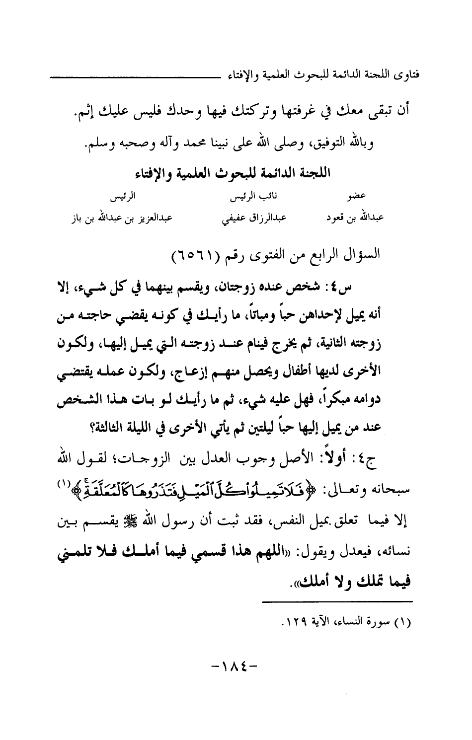 ج4: أولا: الأصل وجوب العدل بين الزوجات؛ لقول الله سبحانه وتعالى: {فَلَا تَمِيلُوا كُلَّ الْمَيْلِ فَتَذَرُوهَا كَالْمُعَلَّقَةِ} (¬1) إلا فيما تعلق بميل النفس، فقد ثبت أن رسول الله صلى الله عليه وسلم- يقسم بين نسائه، فيعدل ويقول: «اللهم هذا قسمي فيما أملك فلا تلمني فيما تملك ولا أملك (¬2) »