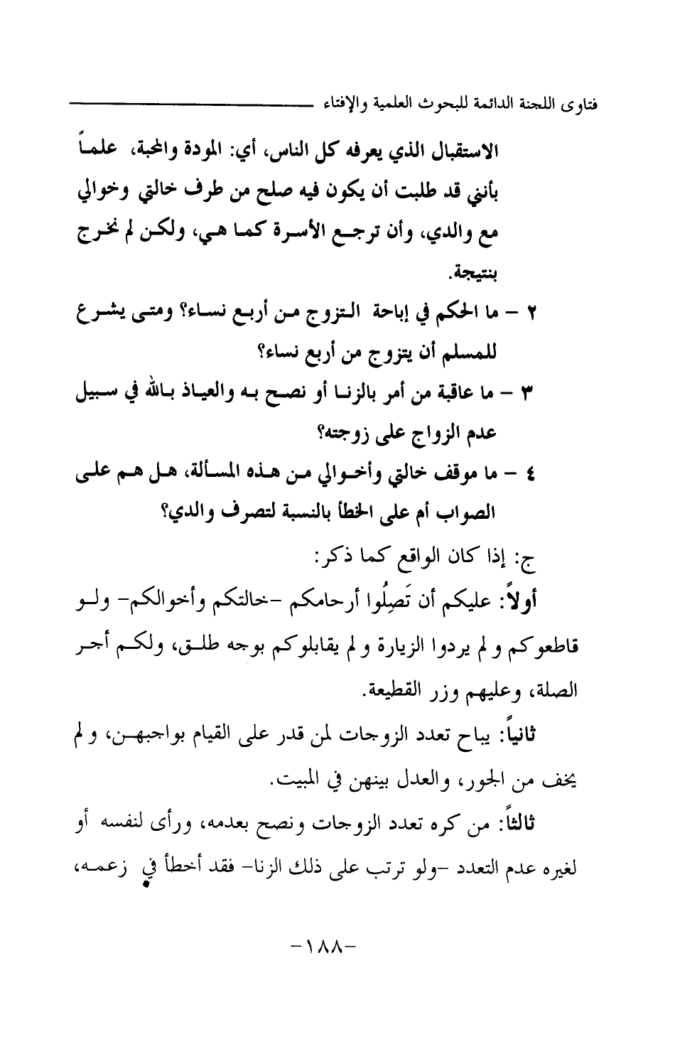 ج: إذا كان الواقع كما ذكر: أولا: عليكم أن تصلوا أرحامكم -خالتكم وأخوالكم- ولو قاطعوكم ولم يردوا الزيارة ولم يقابلوكم بوجه طلق، ولكم أجر الصلة، وعليهم وزر القطيعة. ثانيا: يباح تعدد الزوجات لمن قدر على القيام بواجبهن، ولم يخف من الجور، والعدل بينهن في المبيت. ثالثا: من كره تعدد الزوجات ونصح بعدمه، ورأى لنفسه أو لغيره عدم التعدد -ولو ترتب على ذلك الزنا- فقد أخطأ في زعمه،