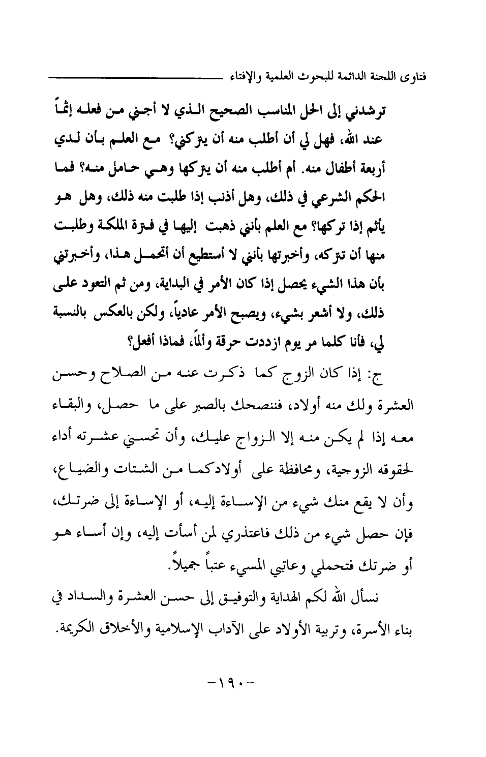 ج: إذا كان الزوج كما ذكرت عنه من الصلاح وحسن العشرة ولك منه أولاد، فننصحك بالصبر على ما حصل، والبقاء معه إذا لم يكن منه إلا الزواج عليك، وأن تحسني عشرته أداء لحقوقه الزوجية، ومحافظة على أولادكما من الشتات والضياع، وأن لا يقع منك شيء من الإساءة إليه، أو الإساءة إلى ضرتك، فإن حصل شيء من ذلك فاعتذري لمن أسأت إليه، وإن أساء هو أو ضرتك فتحملي وعاتبي المسيء عتبا جميلا. نسأل الله لكم الهداية والتوفيق إلى حسن العشرة والسداد في بناء الأسرة، وتربية الأولاد على الآداب الإسلامية والأخلاق الكريمة.