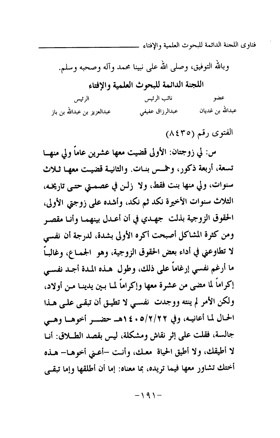 س: لي زوجتان: الأولى قضيت معها عشرين عاما ولي منها تسعة، أربعة ذكور، وخمس بنات. والثانية قضيت معها ثلاث سنوات، ولي منها بنت فقط، ولا زلن في عصمتي حتى تاريخه، الثلاث سنوات الأخيرة نكد ثم نكد، وأشده على زوجتي الأولى، الحقوق الزوجية بذلت جهدي في أن أعدل بينهما وأنا مقصر ومن كثرة المشاكل أصبحت أكره الأولى بشدة، لدرجة أن نفسي لا تطاوعني في أداء بعض الحقوق الزوجية، وهو الجماع، وغالبا ما أرغم نفسي إرغاما على ذلك، وطول هذه المدة أجد نفسي إكراما لما مضى من عشرة معها وإكراما لما بين يدينا من أولاد، ولكن الأمر لم ينته ووجدت نفسي لا تطيق أن تبقى على هذا الحال لما أعانيه، وفي 22 \ 2 \ 1405 هـ حضر أخوها وهي جالسة، فقلت على إثر نقاش ومشكلة، ليس بقصد الطلاق: أنا لا أطيقك، ولا أطيق الحياة معك، وأنت -أعني أخوها- هذه أختك تشاور معها فيما تريده، بما معناه: إما أن أطلقها وإما تبقى