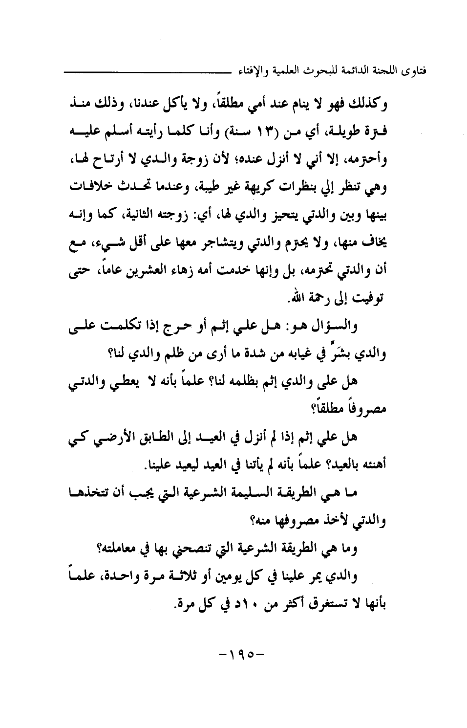 وكذلك فهو لا ينام عند أمي مطلقا، ولا يأكل عندنا، وذلك منذ فترة طويلة، أي من (13 سنة) وأنا كلما رأيته أسلم عليه وأحترمه، إلا أني لا أنزل عنده؛ لأن زوجة والدي لا أرتاح لها، وهي تنظر إلي بنظرات كريهة غير طيبة، وعندما تحدث خلافات بيننا وبين والدتي يتحيز والدي لها، أي: زوجته الثانية، كما وإنه يخاف منها، ولا يحترم والدتي ويتشاجر معها على أقل شيء، مع أن والدتي تحترمه، بل وإنها خدمت أمه زهاء العشرين عاما، حتى توفيت إلى رحمة الله. والسؤال هو: هل علي إثم أو حرج إذا تكلمت على والدي بشر في غيابه من شدة ما أرى من ظلم والدي لنا؟ هل على والدي إثم بظلمه لنا؟ علما بأنه لا يعطي والدتي مصروفا مطلقا؟ هل علي إثم إذا لم أنزل في العيد إلى الطابق الأرضي كي أهنئه بالعيد؟ علما بأنه لم يأتنا في العيد ليعيد علينا. ما هي الطريقة السليمة الشرعية التي يجب أن تتخذها والدتي لأخذ مصروفها منه؟ وما هي الطريقة الشرعية التي تنصحني بها في معاملته؟ والدي يمر علينا في كل يومين أو ثلاثة مرة واحدة، علما بأنها لا تستغرق أكثر من 10 د في كل مرة.