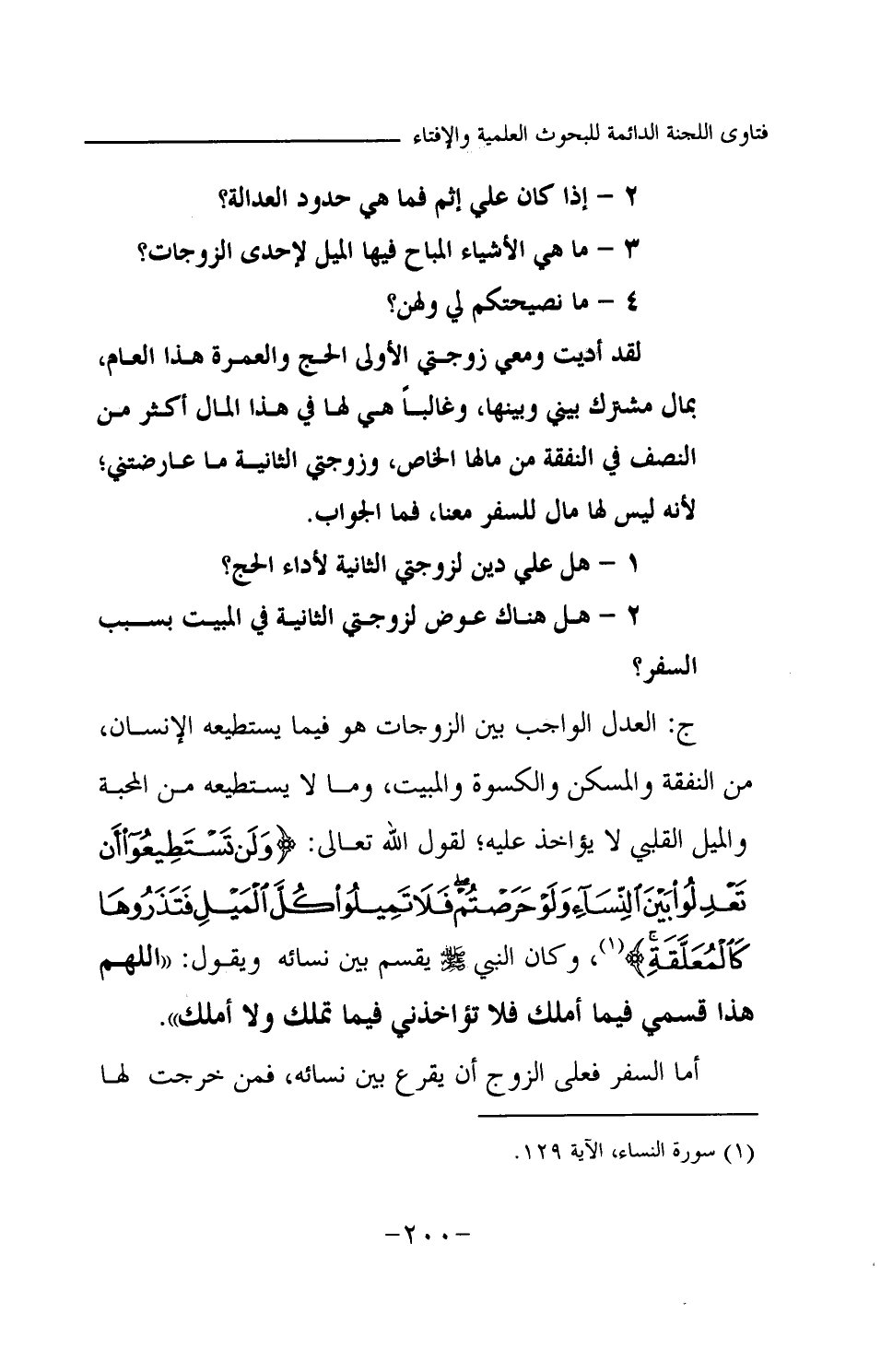 ج: العدل الواجب بين الزوجات هو فيما يستطيعه الإنسان، من النفقة والمسكن والكسوة والمبيت، وما لا يستطيعه من المحبة والميل القلبي لا يؤاخذ عليه؛ لقول الله تعالى: {وَلَنْ تَسْتَطِيعُوا أَنْ تَعْدِلُوا بَيْنَ النِّسَاءِ وَلَوْ حَرَصْتُمْ فَلَا تَمِيلُوا كُلَّ الْمَيْلِ فَتَذَرُوهَا كَالْمُعَلَّقَةِ} (¬1) وكان النبي -صلى الله عليه وسلم- يقسم بين نسائه ويقول: «اللهم هذا قسمي فيما أملك فلا تؤاخذني فيما تملك ولا أملك (¬2) » أما السفر فعلى الزوج أن يقرع بين نسائه، فمن خرجت لها