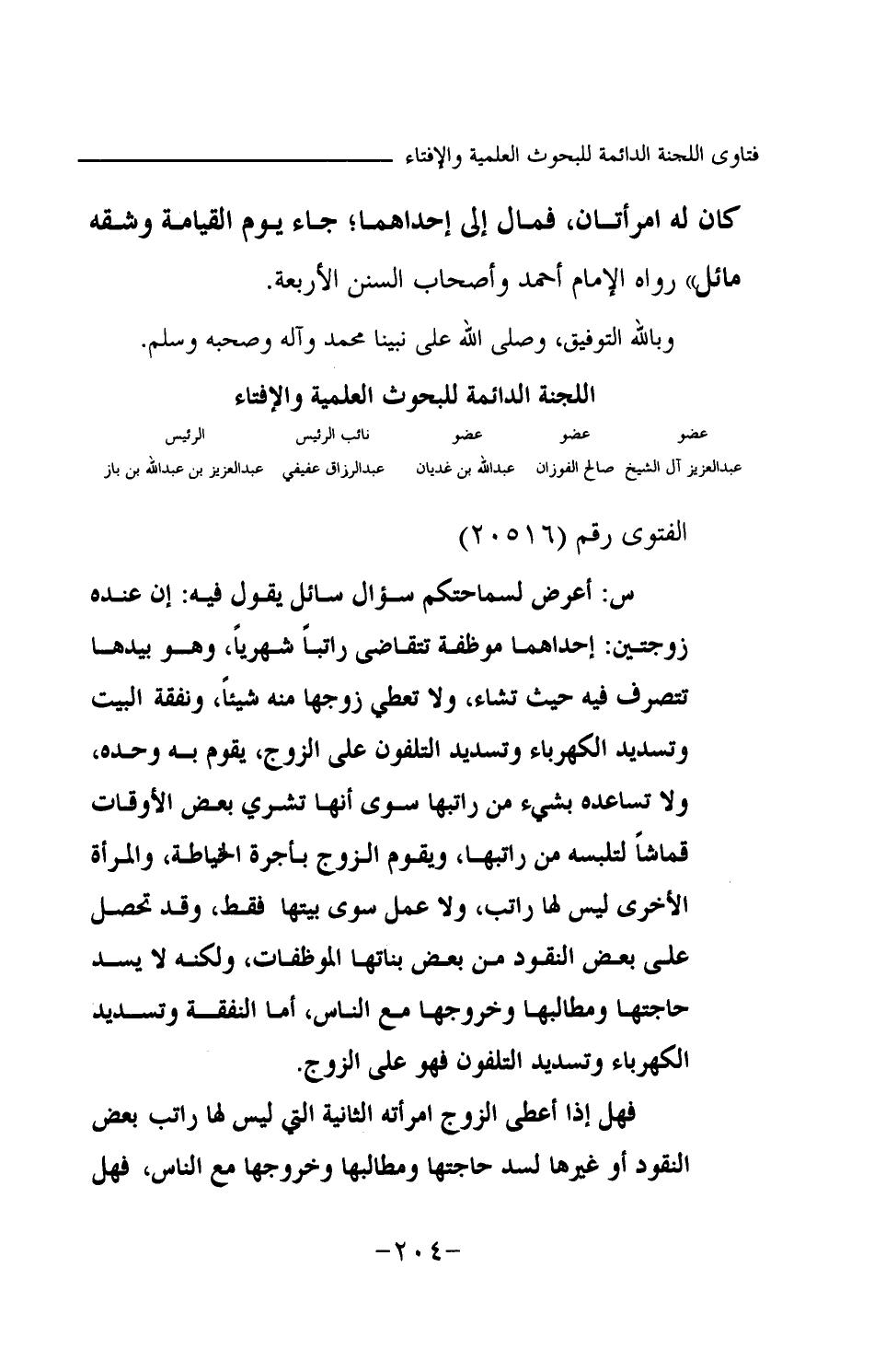 س: أعرض لسماحتكم سؤال سائل يقول فيه: إن عنده زوجتين: إحداهما موظفة تتقاضى راتبا شهريا، وهو بيدها تتصرف فيه حيث تشاء، ولا تعطي زوجها منه شيئا، ونفقة البيت وتسديد الكهرباء وتسديد التلفون على الزوج، يقوم به وحده، ولا تساعده بشيء من راتبها سوى أنها تشري بعض الأوقات قماشا لتلبسه من راتبها، ويقوم الزوج بأجرة الخياطة، والمرأة الأخرى ليس لها راتب، ولا عمل سوى بيتها فقط، وقد تحصل على بعض النقود من بعض بناتها الموظفات، ولكنه لا يسد حاجتها ومطالبها وخروجها مع الناس، أما النفقة وتسديد الكهرباء وتسديد التلفون فهو على الزوج.