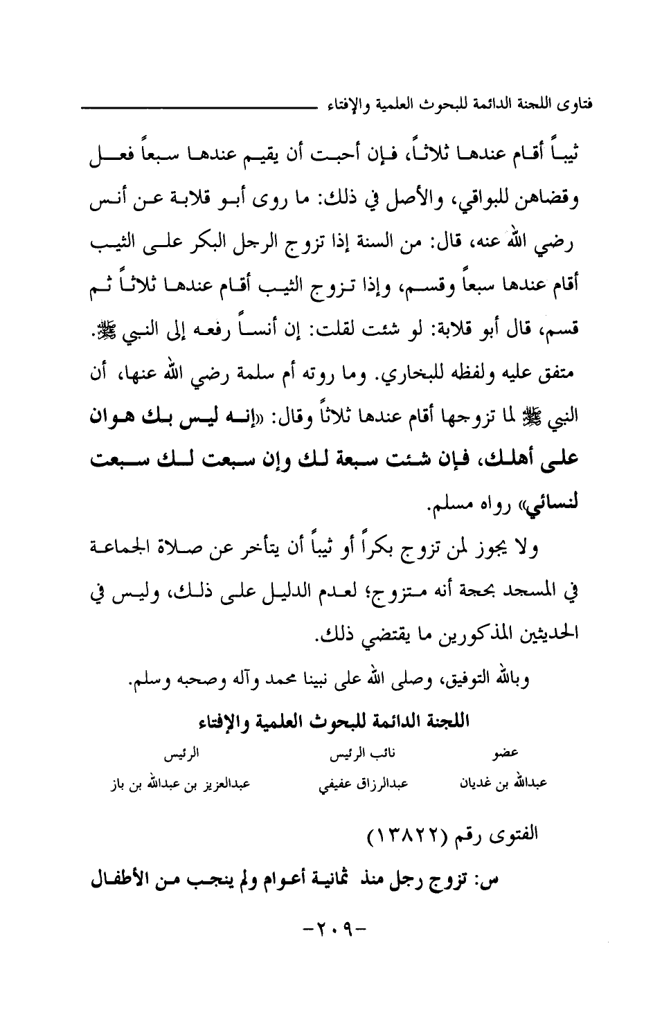 ثيبا أقام عندها ثلاثا، فإن أحبت أن يقيم عندها سبعا فعل وقضاهن للبواقي، والأصل في ذلك: ما روى أبو قلابة عن أنس -رضي الله عنه-، قال: «من السنة إذا تزوج الرجل البكر على الثيب أقام عندها سبعا وقسم، وإذا تزوج الثيب أقام عندها ثلاثا ثم قسم، قال أبو قلابة: لو شئت لقلت: إن أنسا رفعه إلى النبي -صلى الله عليه وسلم- (¬1) » . متفق عليه ولفظه للبخاري. وما روته أم سلمة -رضي الله عنها-، «أن النبي -صلى الله عليه وسلم- لما تزوجها أقام عندها ثلاثا وقال: إنه ليس بك هوان على أهلك، فإن شئت سبعة لك وإن سبعت لك سبعت لنسائي (¬2) » رواه مسلم. ولا يجوز لمن تزوج بكرا أو ثيبا أن يتأخر عن صلاة الجماعة في المسجد بحجة أنه متزوج؛ لعدم الدليل على ذلك، وليس في الحديثين المذكورين ما يقتضي ذلك. وبالله التوفيق، وصلى الله على نبينا محمد وآله وصحبه وسلم.