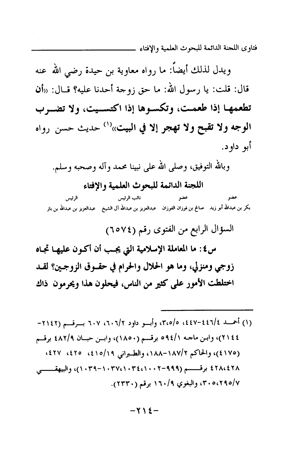 ويدل لذلك أيضا: ما رواه معاوية بن حيدة -رضي الله عنه- قال: «قلت: يا رسول الله: ما حق زوجة أحدنا عليه؟ قال: أن تطعمها إذا طعمت، وتكسوها إذا اكتسيت، ولا تضرب الوجه ولا تقبح ولا تهجر إلا في البيت (¬1) » حديث حسن رواه أبو داود. وبالله التوفيق، وصلى الله على نبينا محمد وآله وصحبه وسلم.