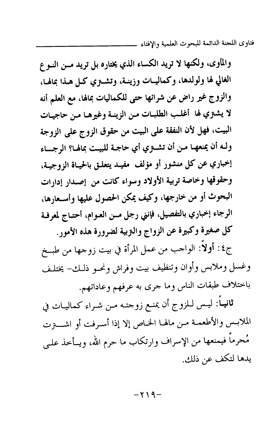 ج 4: أولا: الواجب من عمل المرأة في بيت زوجها من طبخ وغسل وملابس وأوان وتنظيف بيت وفراش ونحو ذلك- يختلف باختلاف طبقات الناس وما جرى به عرفهم وعاداتهم. ثانيا: ليس للزوج أن يمنع زوجته من شراء كماليات في الملابس والأطعمة من مالها الخاص إلا إذا أسرفت أو اشترت محرما فيمنعها من الإسراف وارتكاب ما حرم الله، ويأخذ على يدها لتكف عن ذلك.