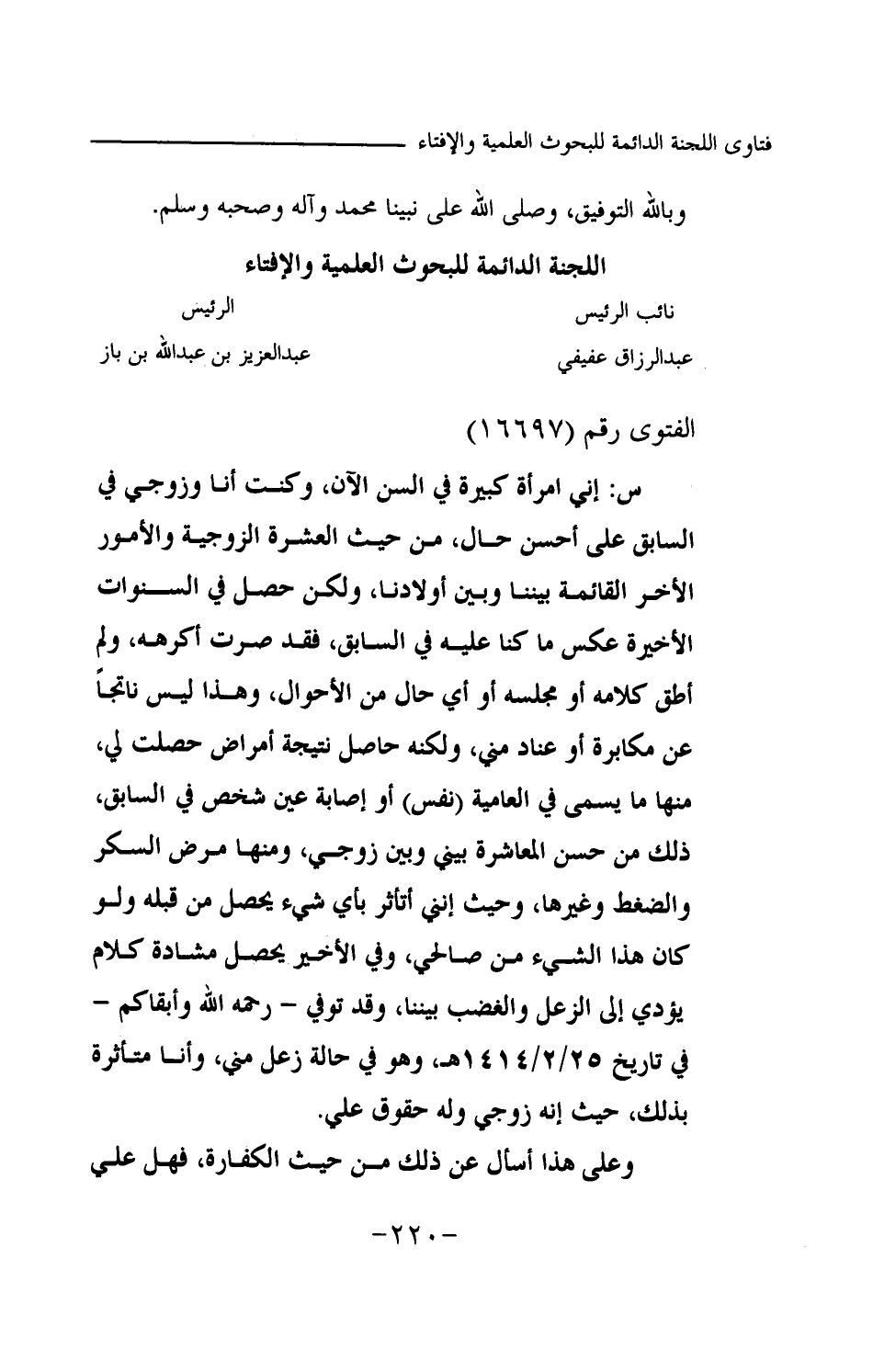 س: إني امرأة كبيرة في السن الآن، وكنت أنا وزوجي في السابق على أحسن حال، من حيث العشرة الزوجية والأمور الأخر القائمة بيننا وبين أولادنا، ولكن حصل في السنوات الأخيرة عكس ما كنا عليه في السابق، فقد صرت أكرهه، ولم أطق كلامه أو مجلسه أو أي حال من الأحوال، وهذا ليس ناتجا عن مكابرة أو عناد مني، ولكنه حاصل نتيجة أمراض حصلت لي، منها ما يسمى في العامية (نفس) أو إصابة عين شخص في السابق، ذلك من حسن المعاشرة بيني وبين زوجي، ومنها مرض السكر والضغط وغيرها، وحيث إنني أتأثر بأي شيء يحصل من قبله ولو كان هذا الشيء من صالحي، وفي الأخير يحصل مشادة كلام يؤدي إلى الزعل والغضب بيننا، وقد توفي -رحمه الله وأبقاكم- في تاريخ 25 \ 2 \ 1414 هـ، وهو في حالة زعل مني، وأنا متأثرة بذلك، حيث إنه زوجي وله حقوق علي. وعلى هذا أسأل عن ذلك من حيث الكفارة، فهل علي