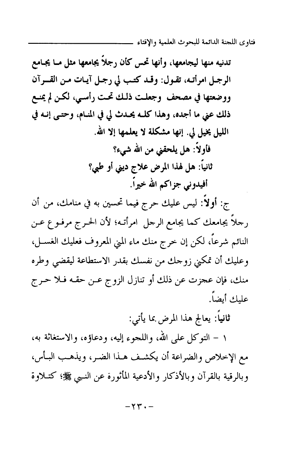 ج: أولا: ليس عليك حرج فيما تحسين به في منامك، من أن رجلا يجامعك كما يجامع الرجل امرأته؟ لأن الحرج مرفوع عن النائم شرعا، لكن إن خرج منك ماء المني المعروف فعليك الغسل، وعليك أن تمكني زوجك من نفسك بقدر الاستطاعة ليقضي وطره منك، فإذا عجزت عن ذلك أو تنازل الزوج عن حقه فلا حرج عليك أيضا. ثانيا: يعالج هذا المرض بما يأتي: 1 - التوكل على الله، واللجوء إليه، ودعاؤه، والاستغاثة به، مع الإخلاص والضراعة أن يكشف هذا الضر، ويذهب البأس، وبالرقية بالقرآن وبالأذكار والأدعية المأثورة عن النبي -صلى الله عليه وسلم- كتلاوة