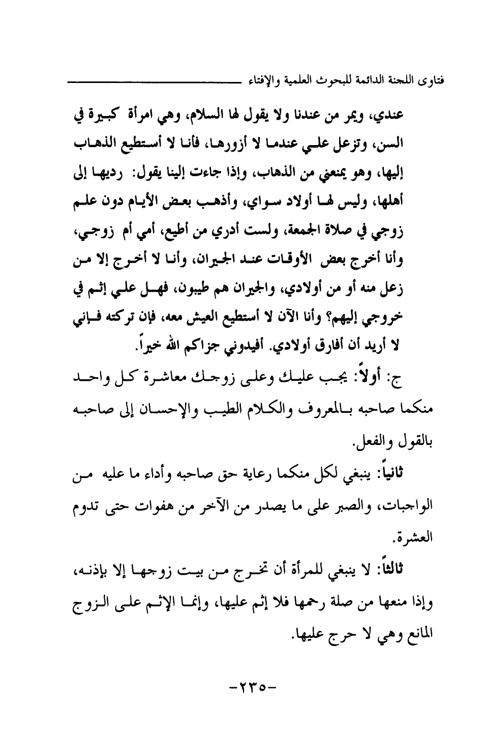 ج: أولا: يجب عليك وعلى زوجك معاشرة كل واحد منكما صاحبه بالمعروف والكلام الطيب والإحسان إلى صاحبه بالقول والفعل. ثانيا: ينبغي لكل منكما رعاية حق صاحبه وأداء ما عليه من الواجبات، والصبر على ما يصدر من الآخر من هفوات حتى تدوم العشرة. ثالثا: لا ينبغي للمرأة أن تخرج من بيت زوجها إلا بإذنه، وإذا منعها من صلة رحمها فلا إثم عليها، وإنما الإثم على الزوج المانع وهي لا حرج عليها.