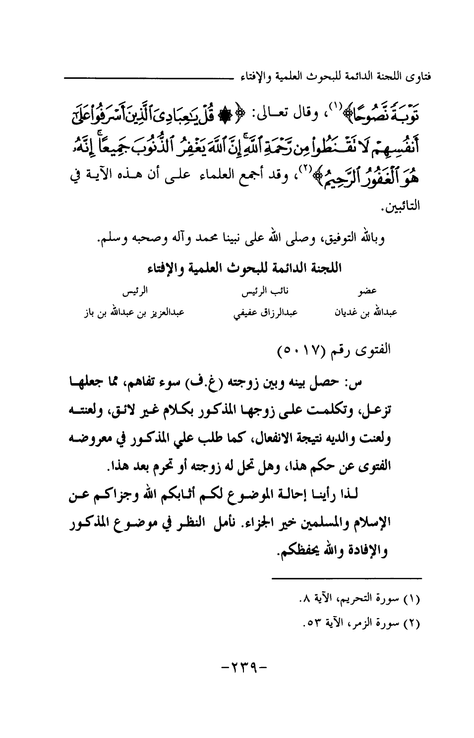 وقال تعالى: {قُلْ يَا عِبَادِيَ الَّذِينَ أَسْرَفُوا عَلَى أَنْفُسِهِمْ لَا تَقْنَطُوا مِنْ رَحْمَةِ اللَّهِ إِنَّ اللَّهَ يَغْفِرُ الذُّنُوبَ جَمِيعًا إِنَّهُ هُوَ الْغَفُورُ الرَّحِيمُ} (¬1) وقد أجمع العلماء على أن هذه الآية في التائبين. وبالله التوفيق، وصلى الله على نبينا محمد وآله وصحبه وسلم.