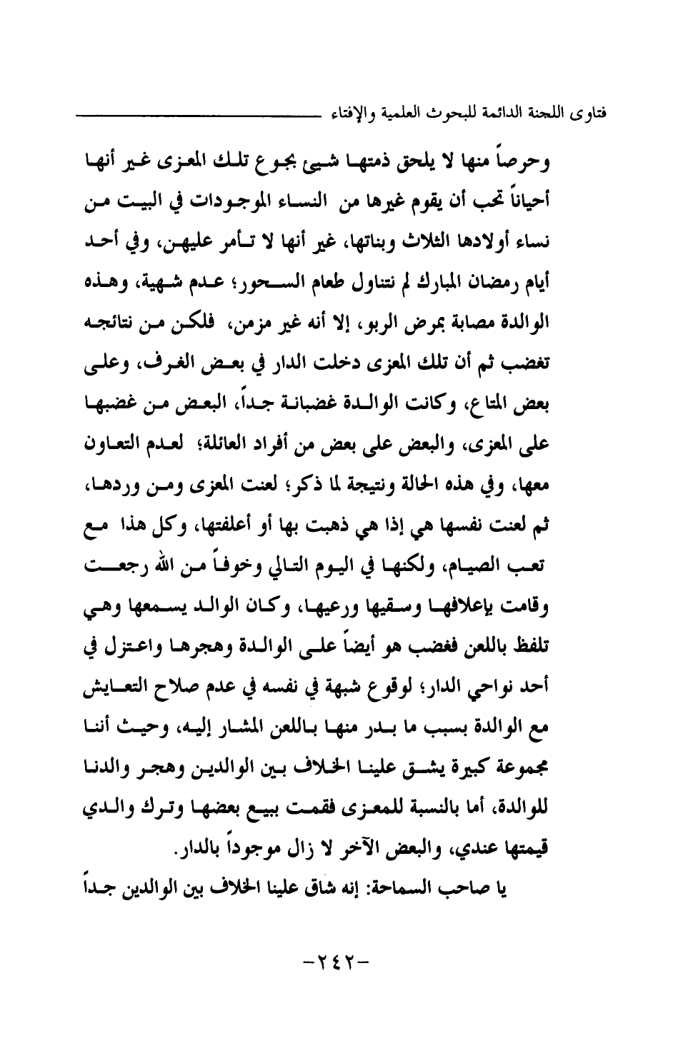 وحرصا منها لا يلحق ذمتها شيء بجوع تلك المعزى غير أنها أحيانا تحب أن يقوم غيرها من النساء الموجودات في البيت من نساء أولادها الثلاث وبناتها، غير أنها لا تأمر عليهن، وفي أحد أيام رمضان المبارك لم نتناول طعام السحور؛ عدم شهية، وهذه الوالدة مصابة بمرض الربو، إلا أنه غير مزمن، فلكن من نتائجه تغضب ثم إن تلك المعزى دخلت الدار في بعض الغرف، وعلى بعض المتاع، وكانت الوالدة غضبانة جدا، البعض من غضبها على المعزى، والبعض على بعض من أفراد العائلة؛ لعدم التعاون معها، وفي هذه الحالة ونتيجة لما ذكر؛ لعنت المعزى ومن وردها، ثم لعنت نفسها هي إذا هي ذهبت بها أو أعلفتها، وكل هذا مع تعب الصيام، ولكنها في اليوم التالي وخوفا من الله رجعت وقامت بإعلافها وسقيها ورعيها، وكان الوالد يسمعها وهي تلفظ باللعن فغضب هو أيضا على الوالدة وهجرها واعتزل في أحد نواحي الدار؛ لوقوع شبهة في نفسه في عدم صلاح التعايش مع الوالدة بسبب ما بدر منها باللعن المشار إليه، وحيث إننا مجموعة كبيرة يشق علينا الخلاف بين الوالدين وهجر والدنا للوالدة، أما بالنسبة للمعزى فقمت ببيع بعضها وترك والدي قيمتها عندي، والبعض الآخر لا زال موجودا بالدار. يا صاحب السماحة: إنه شاق علينا الخلاف بين الوالدين جدا