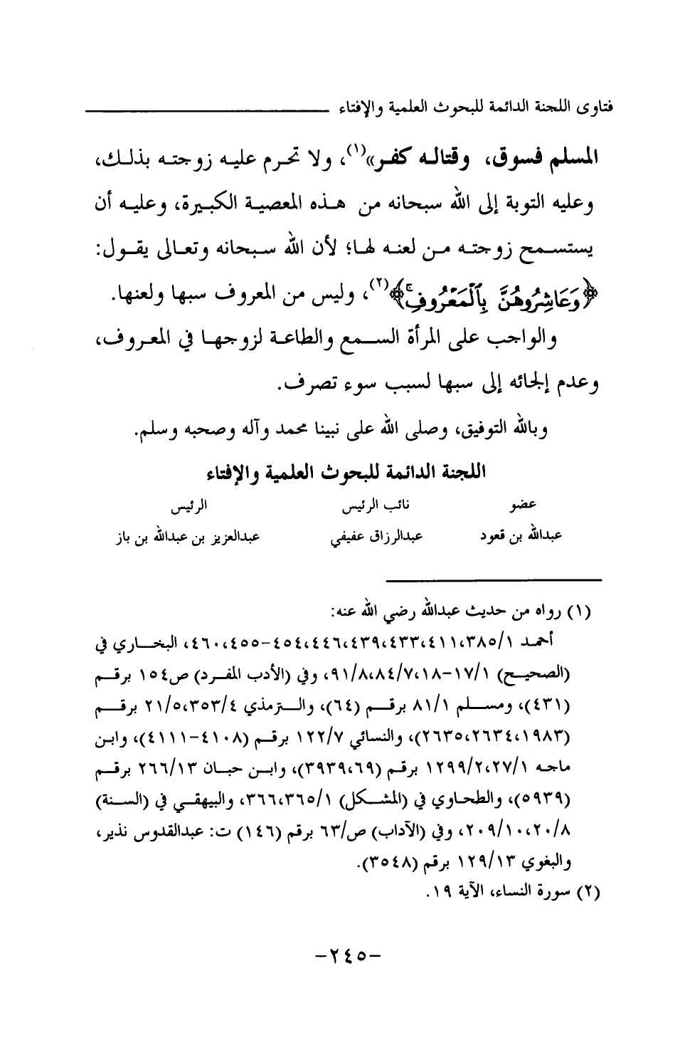 المسلم فسوق، وقتاله كفر (¬1) » ولا تحرم عليه زوجته بذلك، وعليه التوبة إلى الله سبحانه من هذه المعصية الكبيرة، وعليه أن يستسمح زوجته من لعنه لها؛ لأن الله سبحانه وتعالى يقول: {وَعَاشِرُوهُنَّ بِالْمَعْرُوفِ} (¬2) وليس من المعروف سبها ولعنها. والواجب على المرأة السمع والطاعة لزوجها في المعروف، وعدم إلجائه إلى سبها لسبب سوء تصرف. وبالله التوفيق، وصلى الله على نبينا محمد وآله وصحبه وسلم.