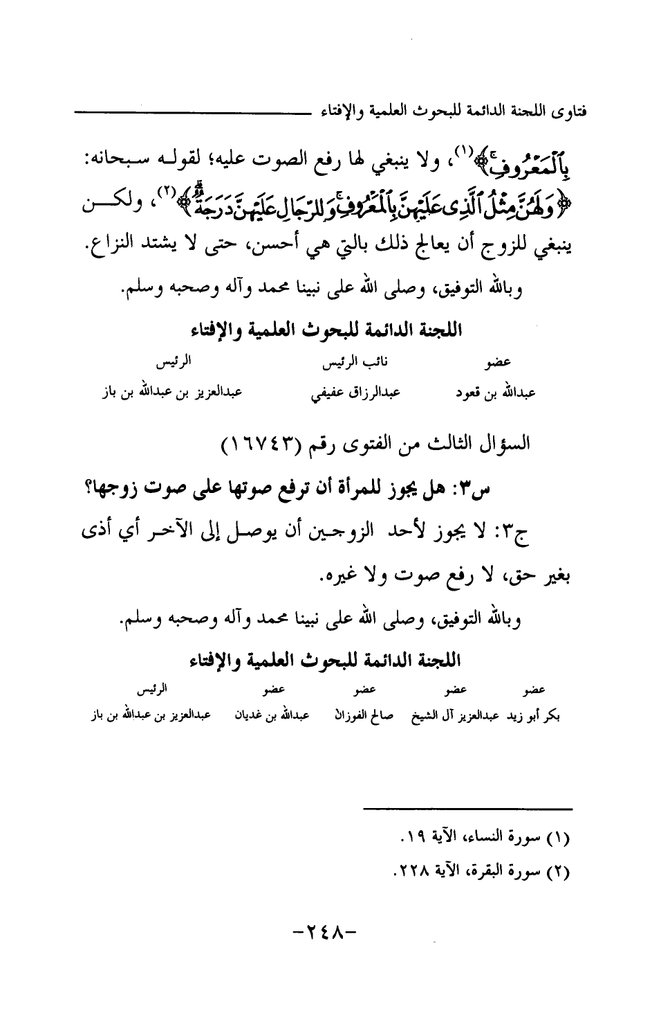 ولا ينبغي لها رفع الصوت عليه؛ لقوله سبحانه: {وَلَهُنَّ مِثْلُ الَّذِي عَلَيْهِنَّ بِالْمَعْرُوفِ وَلِلرِّجَالِ عَلَيْهِنَّ دَرَجَةٌ} (¬1) ولكن ينبغي للزوج أن يعالج ذلك بالتي هي أحسن، حتى لا يشتد النزاع. وبالله التوفيق، وصلى الله على نبينا محمد وآله وصحبه وسلم.