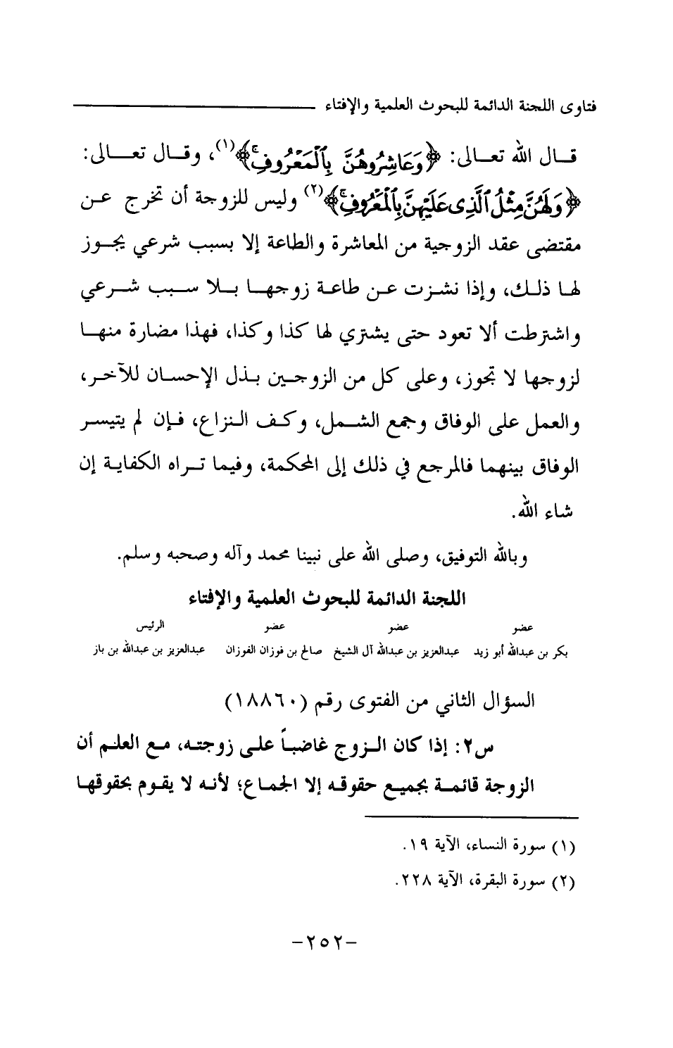 قال الله تعالى: {وَعَاشِرُوهُنَّ بِالْمَعْرُوفِ} (¬1) وقال تعالى: {وَلَهُنَّ مِثْلُ الَّذِي عَلَيْهِنَّ بِالْمَعْرُوفِ} (¬2) وليس للزوجة أن تخرج عن مقتضى عقد الزوجية من المعاشرة والطاعة إلا بسبب شرعي يجوز لها ذلك، وإذا نشزت عن طاعة زوجها بلا سبب شرعي واشترطت ألا تعود حتى يشتري لها كذا وكذا، فهذا مضارة منها لزوجها لا تجوز، وعلى كل من الزوجين بذل الإحسان للآخر، والعمل على الوفاق وجمع الشمل، وكف النزاع، فإن لم يتيسر الوفاق بينهما فالمرجع في ذلك إلى المحكمة، وفيما تراه الكفاية إن شاء الله. وبالله التوفيق، وصلى الله على نبينا محمد وآله وصحبه وسلم.