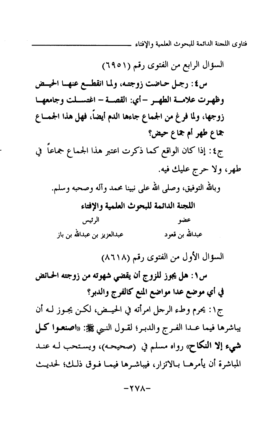 ج1: يحرم وطء الرحل امرأته في الحيض، لكن يجوز له أن يباشرها فيما عدا الفرج والدبر؛ لقول النبي -صلى الله عليه وسلم-: «اصنعوا كل شيء إلا النكاح (¬1) » رواه مسلم في (صحيحه) ويستحب له عند المباشرة أن يأمرها بالاتزار، فيباشرها فيما فوق ذلك؛ لحديث
