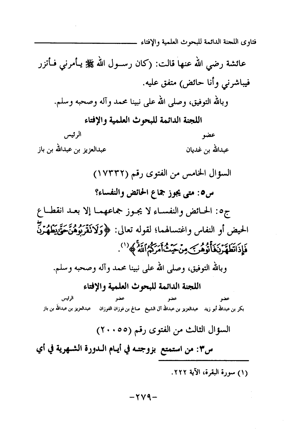 ج5: الحائض والنفساء لا يجوز جماعهما إلا بعد انقطاع الحيض أو النفاس واغتسالهما؛ لقوله تعالى: {وَلَا تَقْرَبُوهُنَّ حَتَّى يَطْهُرْنَ فَإِذَا تَطَهَّرْنَ فَأْتُوهُنَّ مِنْ حَيْثُ أَمَرَكُمُ اللَّهُ} (¬1) وبالله التوفيق، وصلى الله على نبينا محمد وآله وصحبه وسلم.