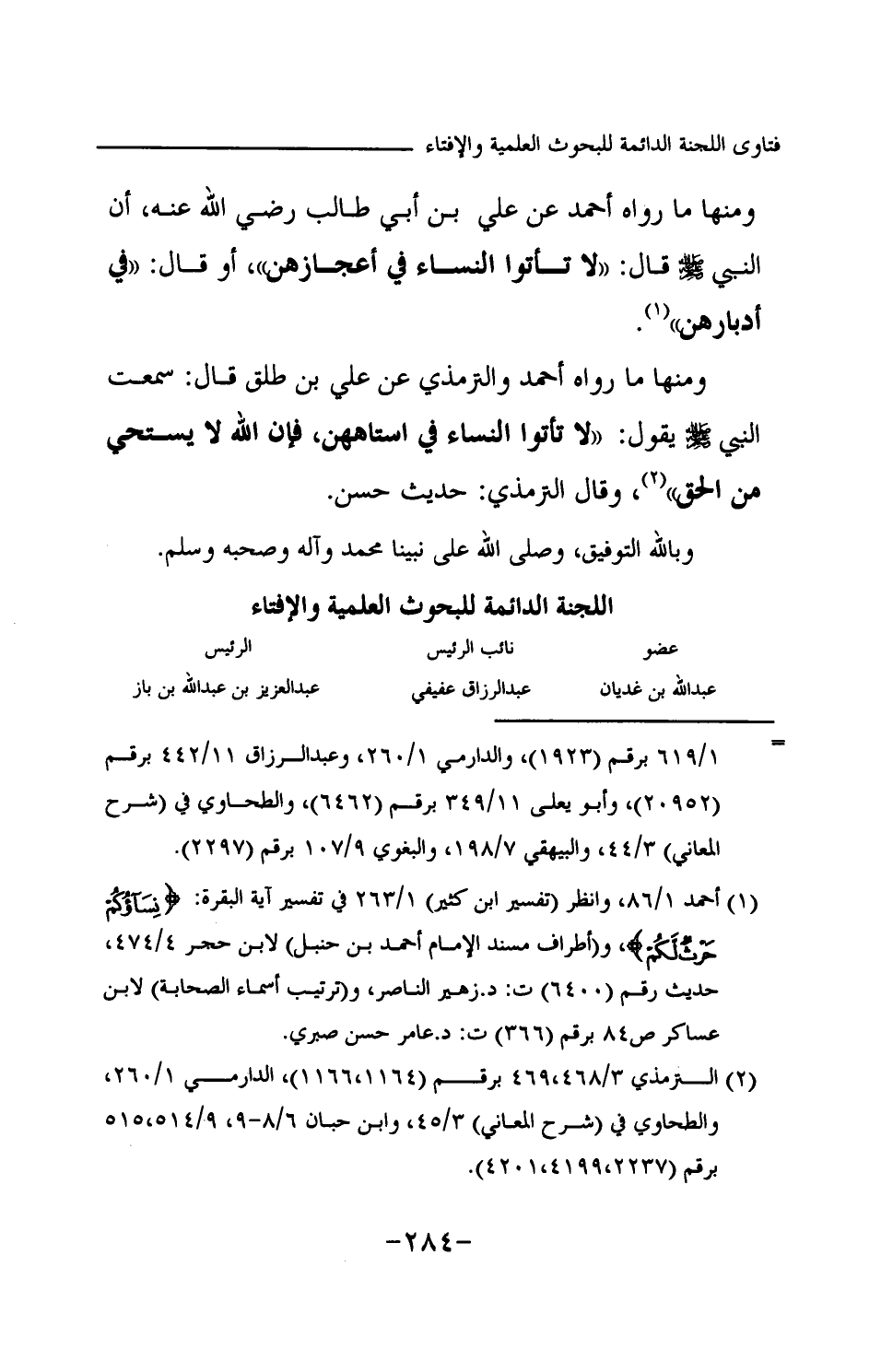 ومنها ما رواه أحمد عن علي بن أبي طالب رضي الله عنه، أن النبي -صلى الله عليه وسلم- قال: «لا تأتوا النساء في أعجازهن، أو قال: "في أدبارهن (¬1) » ومنها ما رواه أحمد والترمذي عن علي بن طلق قال: سمعت النبي -صلى الله عليه وسلم- يقول: «لا تأتوا النساء في استاههن، فإن الله لا يستحي من الحق (¬2) » وقال الترمذي: حديث حسن. وبالله التوفيق، وصلى الله على نبينا محمد وآله وصحبه وسلم.