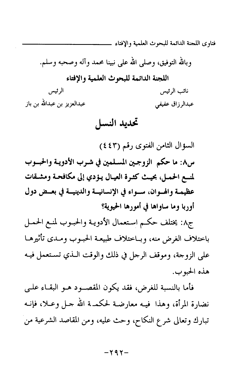 ج 8: يختلف حكم استعمال الأدوية والحبوب لمنع الحمل باختلاف الغرض منه، وباختلاف طبيعة الحبوب ومدى تأثيرها على الزوجة، وموقف الرجل في ذلك والوقت الذي تستعمل فيه هذه الحبوب. فأما بالنسبة للغرض، فقد يكون المقصود هو البقاء على نضارة المرأة، وهذا فيه معارضة لحكمة الله -جل وعلا-، فإنه -تبارك وتعالى- شرع النكاح، وحث عليه، ومن المقاصد الشرعية من