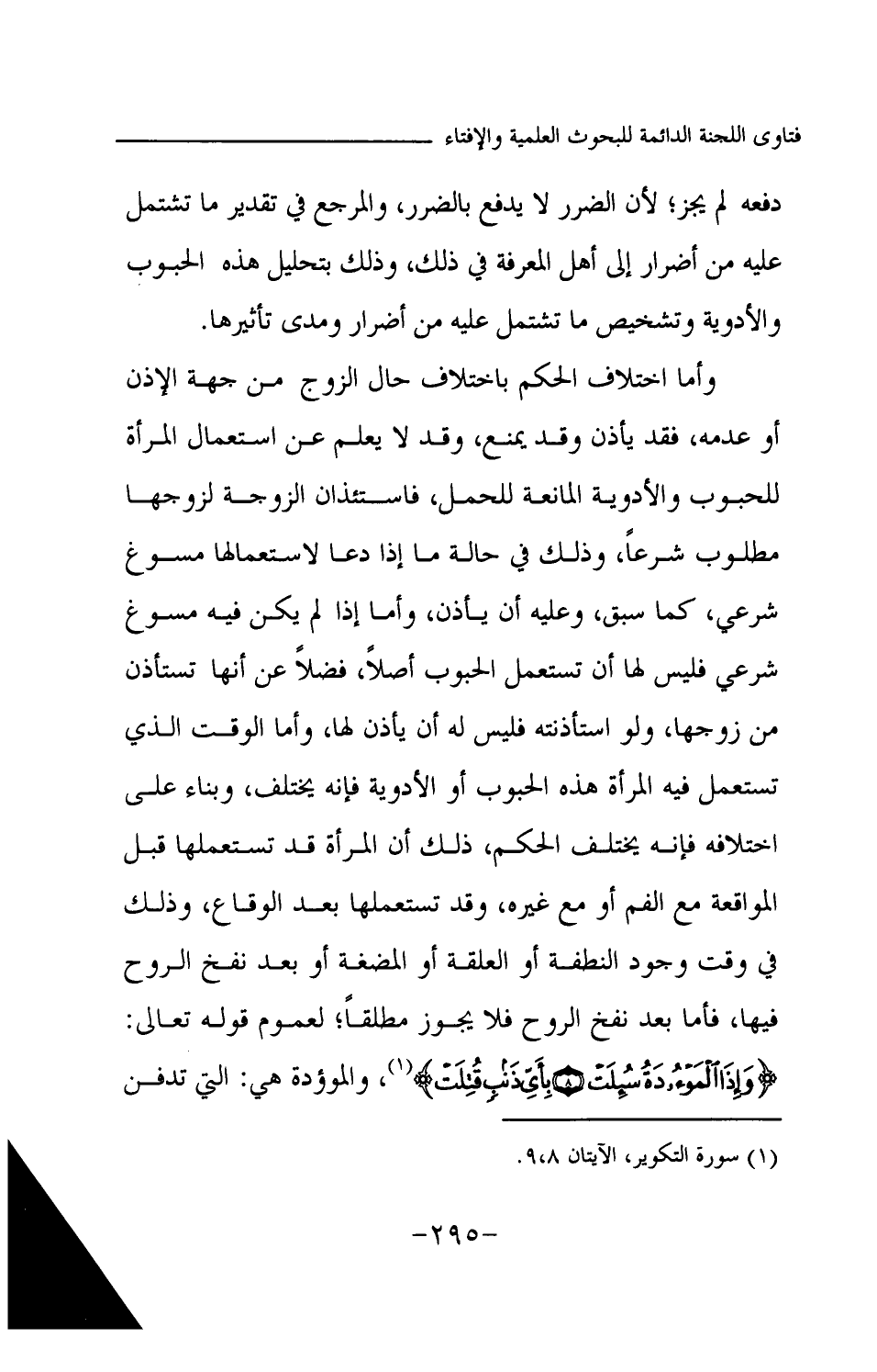 دفعه لم يجز؛ لأن الضرر لا يدفع بالضرر، والمرجع في تقدير ما تشتمل عليه من أضرار إلى أهل المعرفة في ذلك، وذلك بتحليل هذه الحبوب والأدوية وتشخيص ما تشتمل عليه من أضرار ومدى تأثيرها. وأما اختلاف الحكم باختلاف حال الزوج من جهة الإذن أو عدمه، فقد يأذن وقد يمنع، وقد لا يعلم عن استعمال المرأة للحبوب والأدوية المانعة للحمل، فاستئذان الزوجة لزوجها مطلوب شرعا، وذلك في حالة ما إذا دعا لاستعمالها مسوغ شرعي، كما سبق، وعليه أن يأذن، وأما إذا لم يكن فيه مسوغ شرعي فليس لها أن تستعمل الحبوب أصلا، فضلا عن أنها تستأذن من زوجها، ولو استأذنته فليس له أن يأذن لها، وأما الوقت الذي تستعمل فيه المرأة هذه الحبوب أو الأدوية فإنه يختلف، وبناء على اختلافه فإنه يختلف الحكم، ذلك أن المرأة قد تستعملها قبل المواقعة مع الفم أو مع غيره، وقد تستعملها بعد الوقاع، وذلك في وقت وجود النطفة أو العلقة أو المضغة أو بعد نفخ الروح فيها، فأما بعد نفخ الروح فلا يجوز مطلقا؛ لعموم قوله تعالى: {وَإِذَا الْمَوْءُودَةُ سُئِلَتْ} (¬1) {بِأَيِّ ذَنْبٍ قُتِلَتْ} (¬2) والموءودة هي: التي تدفن