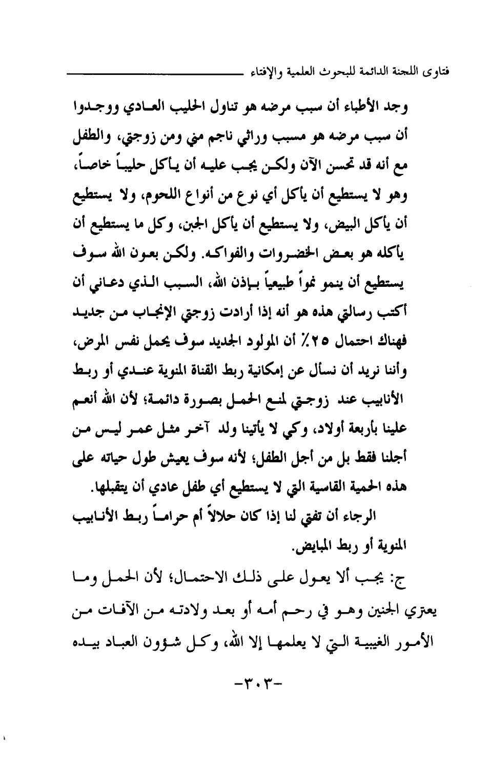 وجد الأطباء أن سبب مرضه هو تناول الحليب العادي ووجدوا أن سبب مرضه هو مسبب وراثي ناجم مني ومن زوجتي، والطفل مع أنه قد تحسن الآن ولكن يجب عليه أن يأكل حليبا خاصا، وهو لا يستطيع أن يأكل أي نوع من أنواع اللحوم، ولا يستطيع أن يأكل البيض، ولا يستطيع أن يأكل الجبن، وكل ما يستطيع أن يأكله هو بعض الخضروات والفواكه. ولكن بعون الله سوف يستطيع أن ينمو نموا طبيعيا بإذن الله. السبب الذي دعاني أن أكتب رسالتي هذه هو أنه إذا أرادت زوجتي الإنجاب من جديد فهناك احتمال 25% أن المولود الجديد سوف يحمل نفس المرض، وأننا نريد أن نسأل عن إمكانية ربط القناة المنوية عندي أو ربط الأنابيب عند زوجتي لمنع الحمل بصورة دائمة؛ لأن الله أنعم علينا بأربعة أولاد، وكي لا يأتينا ولد آخر مثل عمر، ليس من أجلنا فقط، بل من أجل الطفل؛ لأنه سوف يعيش طول حياته على هذه الحمية القاسية التي لا يستطيع أي طفل عادي أن يتقبلها. الرجاء أن تفتي لنا إذا كان حلالا أم حراما ربط الأنابيب المنوية أو ربط المبايض.
