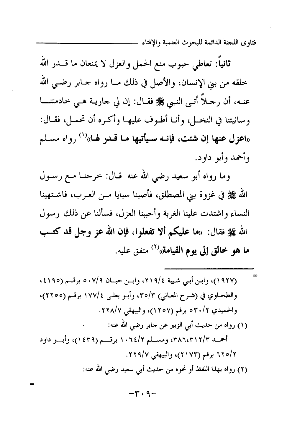 ثانيا: تعاطي حبوب منع الحمل والعزل لا يمنعان ما قدر الله خلقه من بني الإنسان، والأصل في ذلك ما رواه جابر -رضي الله عنه-، «أن رجلا أتى النبي -صلى الله عليه وسلم- فقال: إن لي جارية هي خادمتنا وسانيتنا في النخل، وأنا أطوف عليها وأكره أن تحمل، فقال: "اعزل عنها إن شئت، فإنه سيأتيها ما قدر لها (¬1) » رواه مسلم وأحمد وأبو داود وما رواه أبو سعيد -رضي الله عنه- قال: «خرجنا مع رسول الله -صلى الله عليه وسلم- في غزوة بني المصطلق، فأصبنا سبايا من العرب، فاشتهينا النساء واشتدت علينا الغربة وأحببنا العزل، فسألنا عن ذلك رسول الله -صلى الله عليه وسلم- فقال: ما عليكم ألا تفعلوا، فإن الله -عز وجل- قد كتب ما هو خالق إلى يوم القيامة (¬2) » متفق عليه